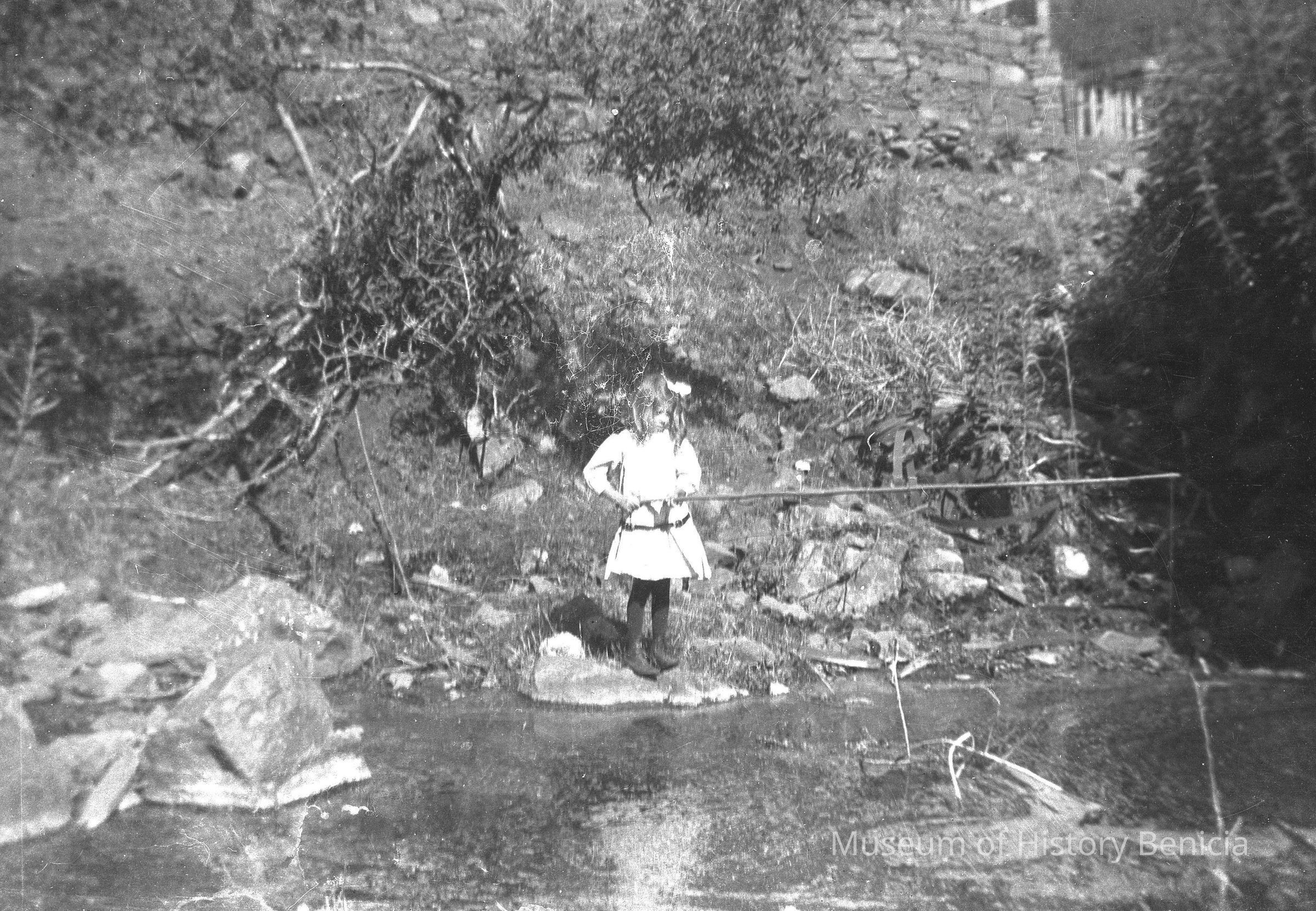 Marguerite or her older sister by a stream fishing.fishing