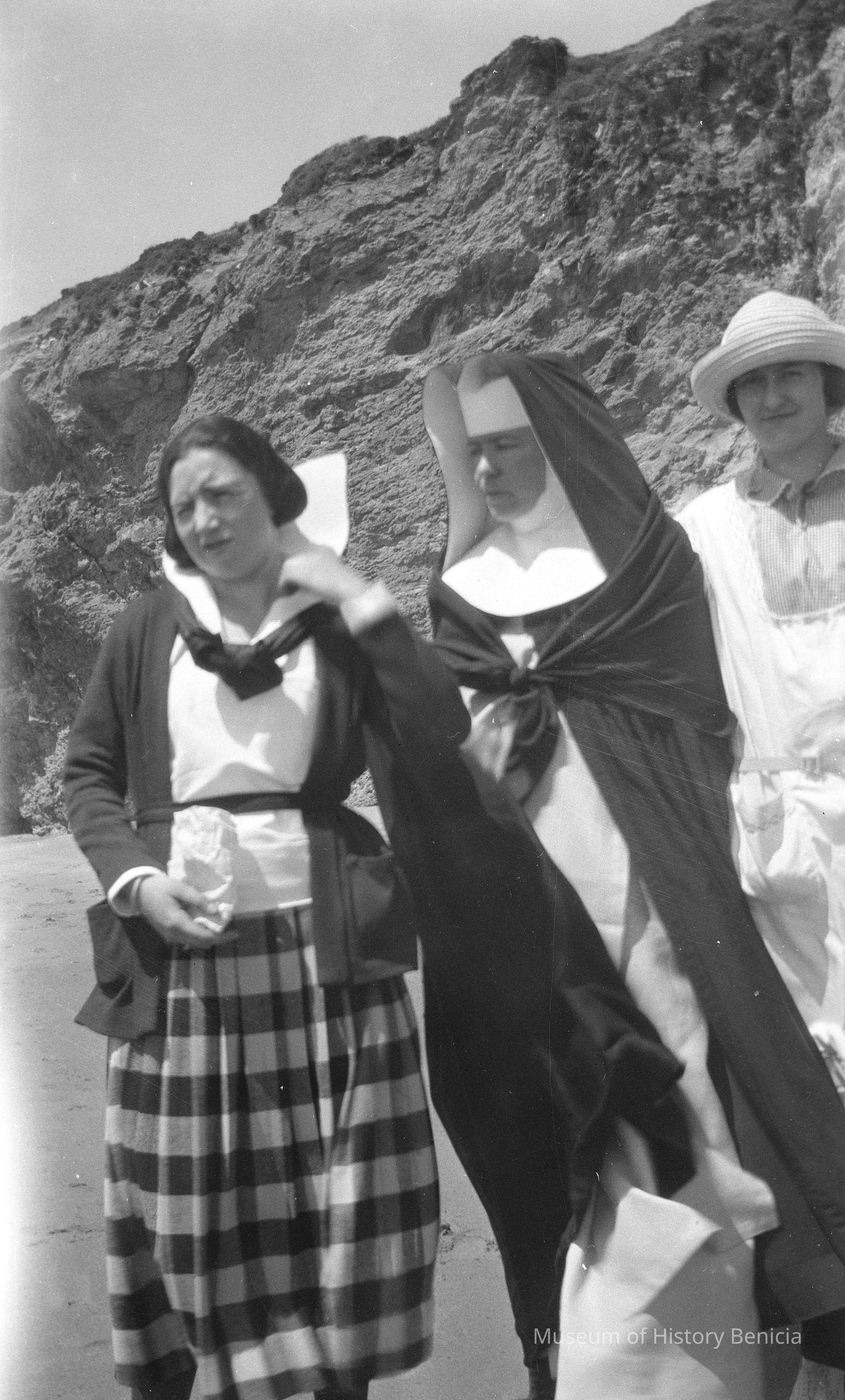 Two women and a nun on a windy beach