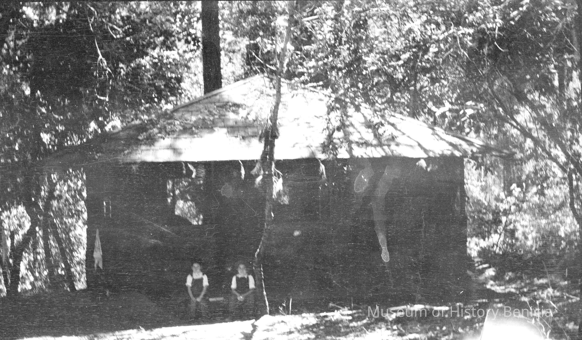 Two kids sitting in front of a cabin