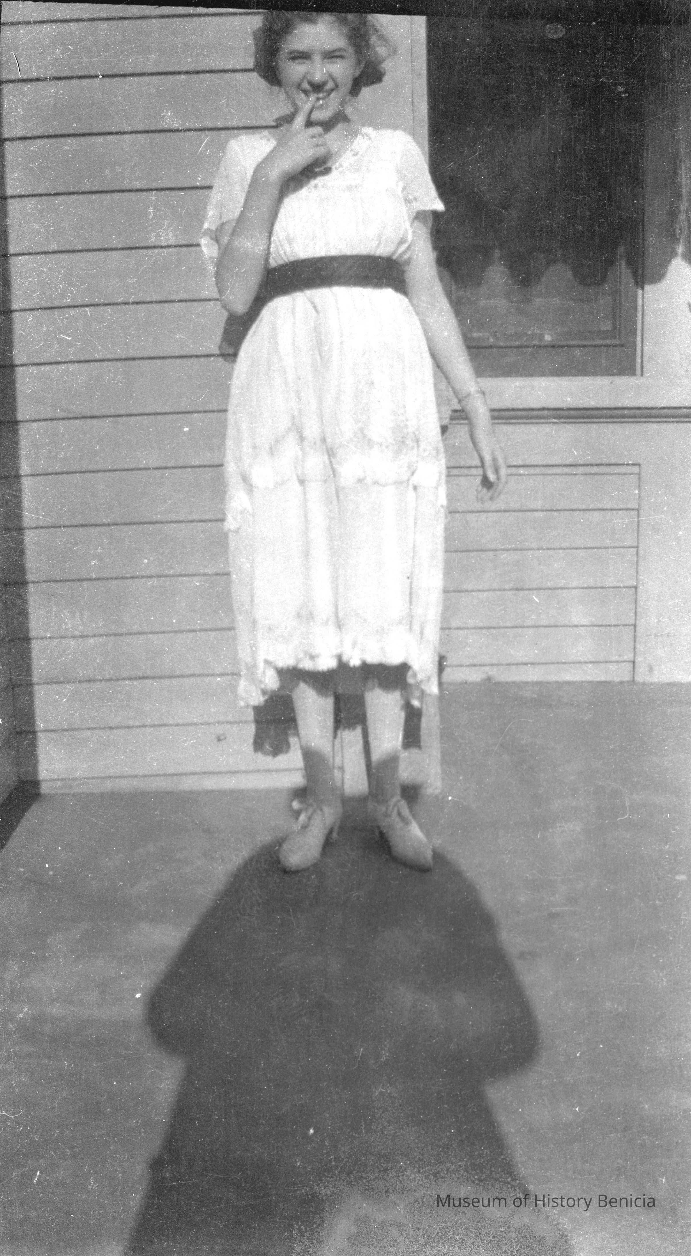 A young woman standing with her finger on her teeth. Woman in front of house. Shadow of the photographer may be a woman. Looks like a dress and the hat looks somewhat like a woman's hat.Collection