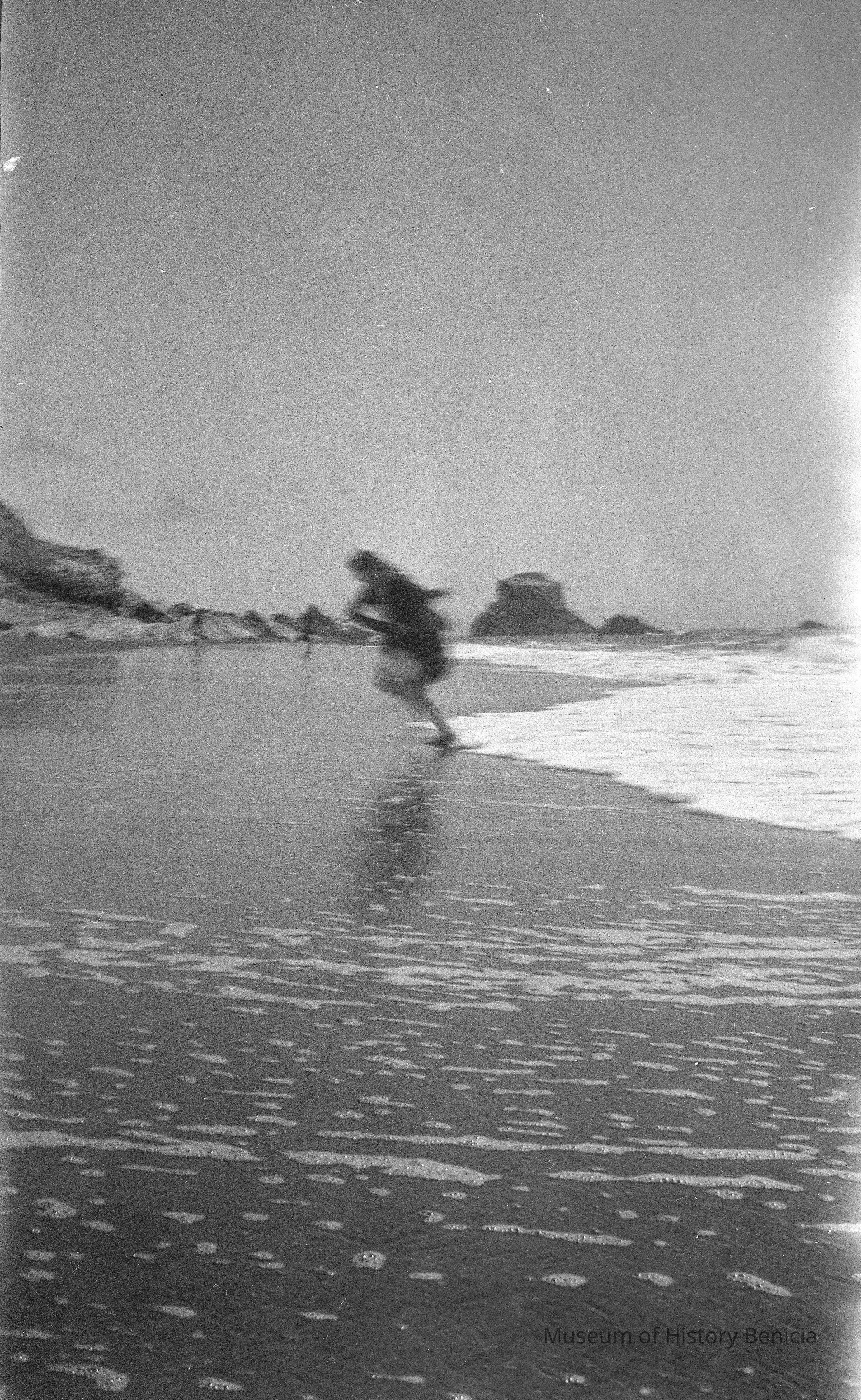 Woman running from a wave at the ocean. Photo is blurred.
