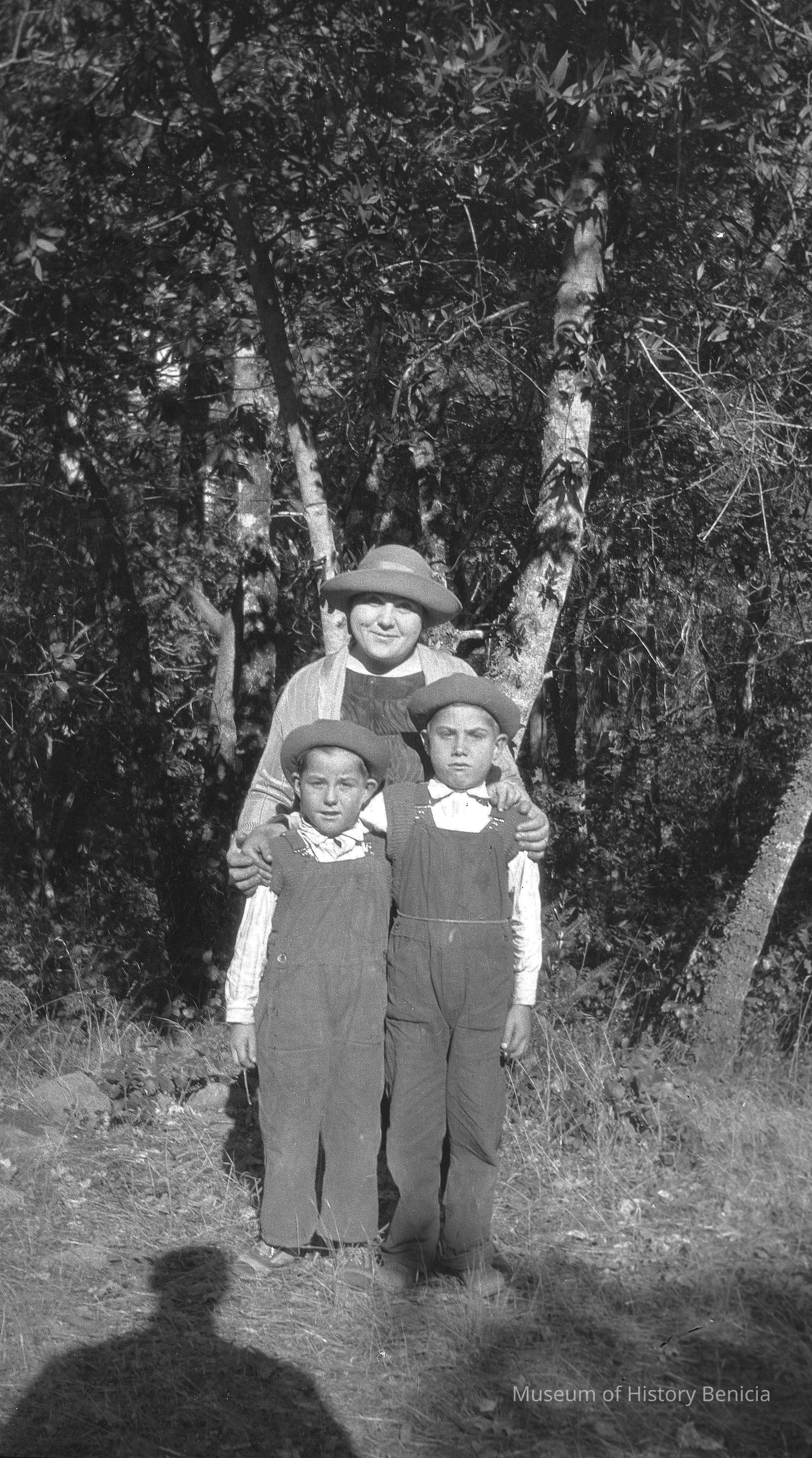 A woman wearing a hat and standing with two boys who are wearing identical outfits. Woman and two boys in the woods. Looks like Mary Canessa.Collection