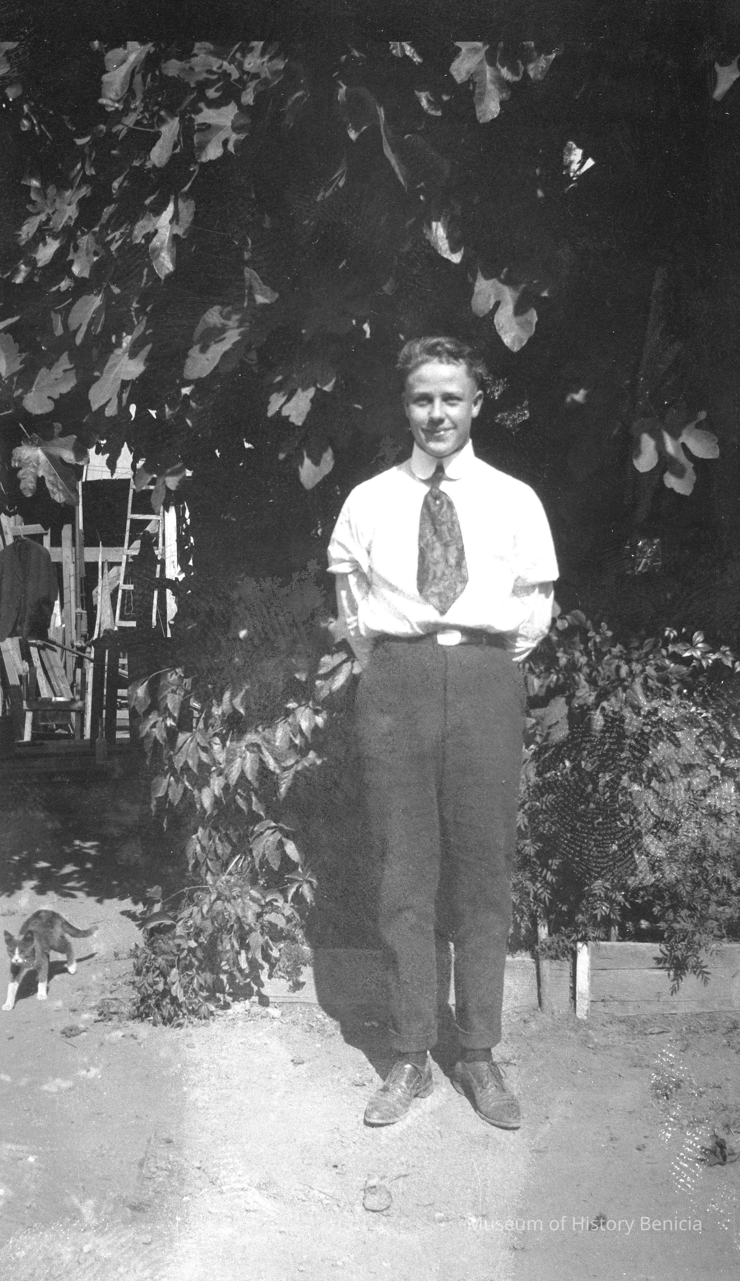 Man in tie. Same as in 662. There is a cat to his left.