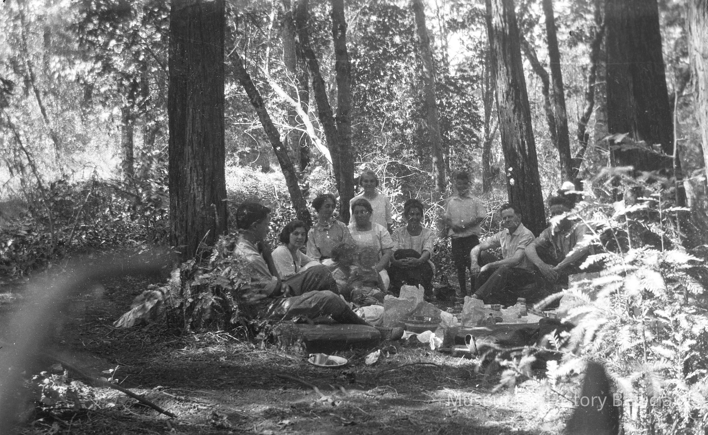 Group of people in the woods including Dita (fourth from left sitting down), Marguerite, and Violet (standing behind Dita) Molfino