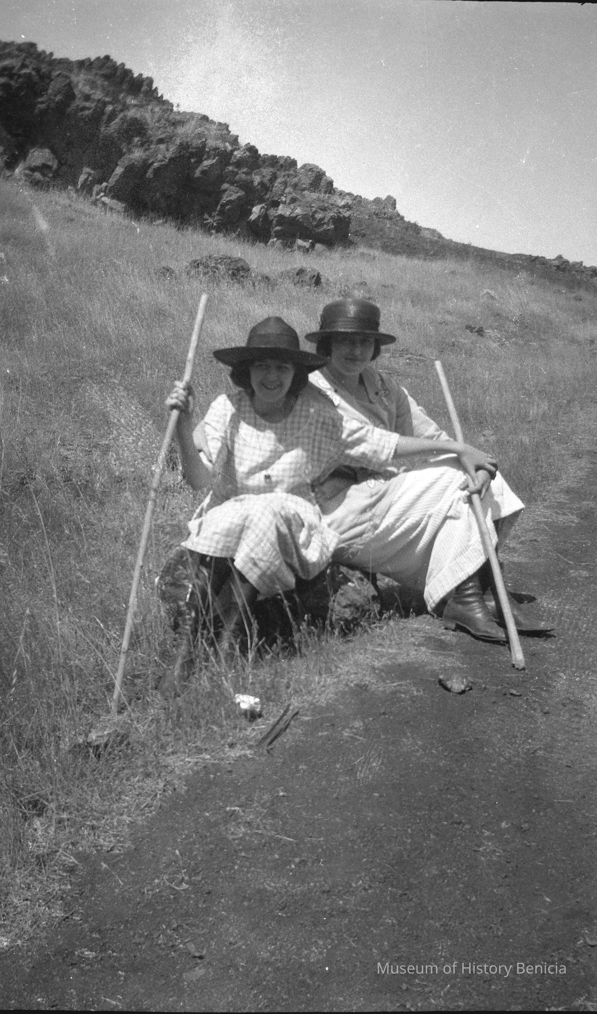 Two women sitting and each is holding a walking stick. Two women with walking sticks in a field next to a rock outcropping. May be around present day Blue Rock Springs in Vallejo.Collection