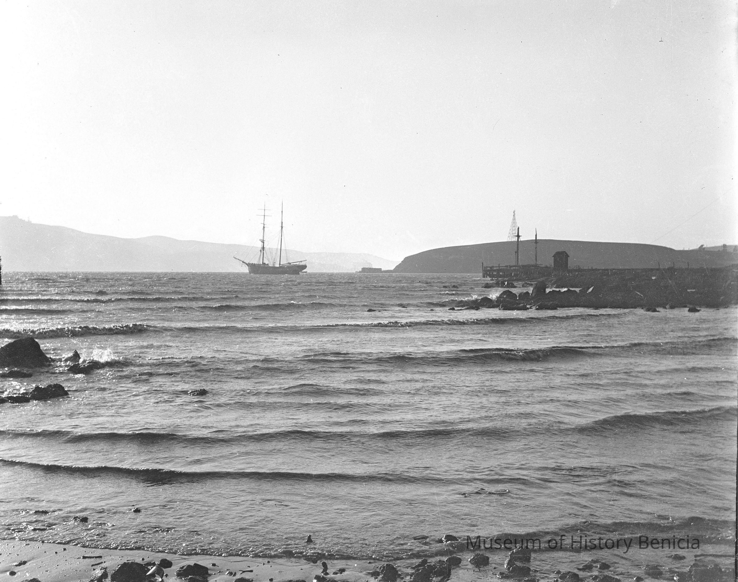 Taken from the shore: rough water and sailing ship. Looking towards Dillon Point