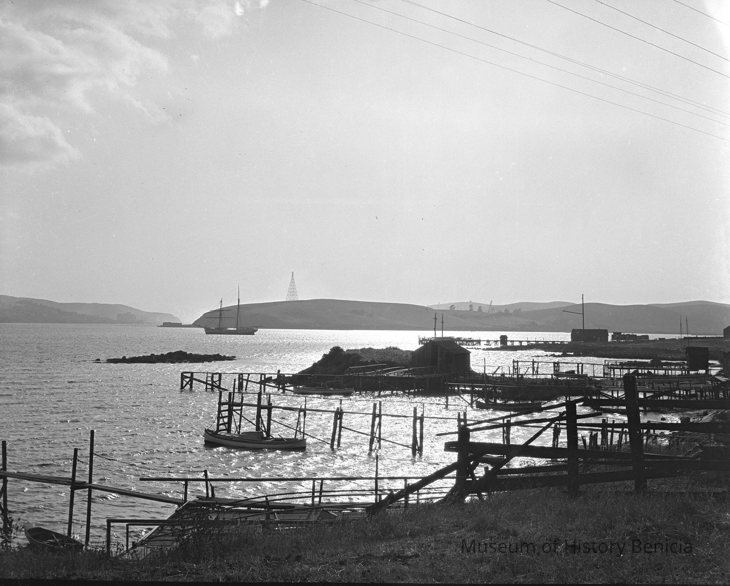 Piers and a boat out on the water. Docks and houses along First street from across Benicia Bay.