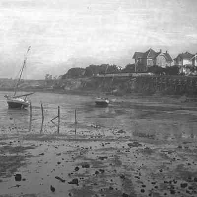View of low tide and cliff with a house (Crook's mansion at 285 West "G" Street next to 271 West "G" Street) at the top.