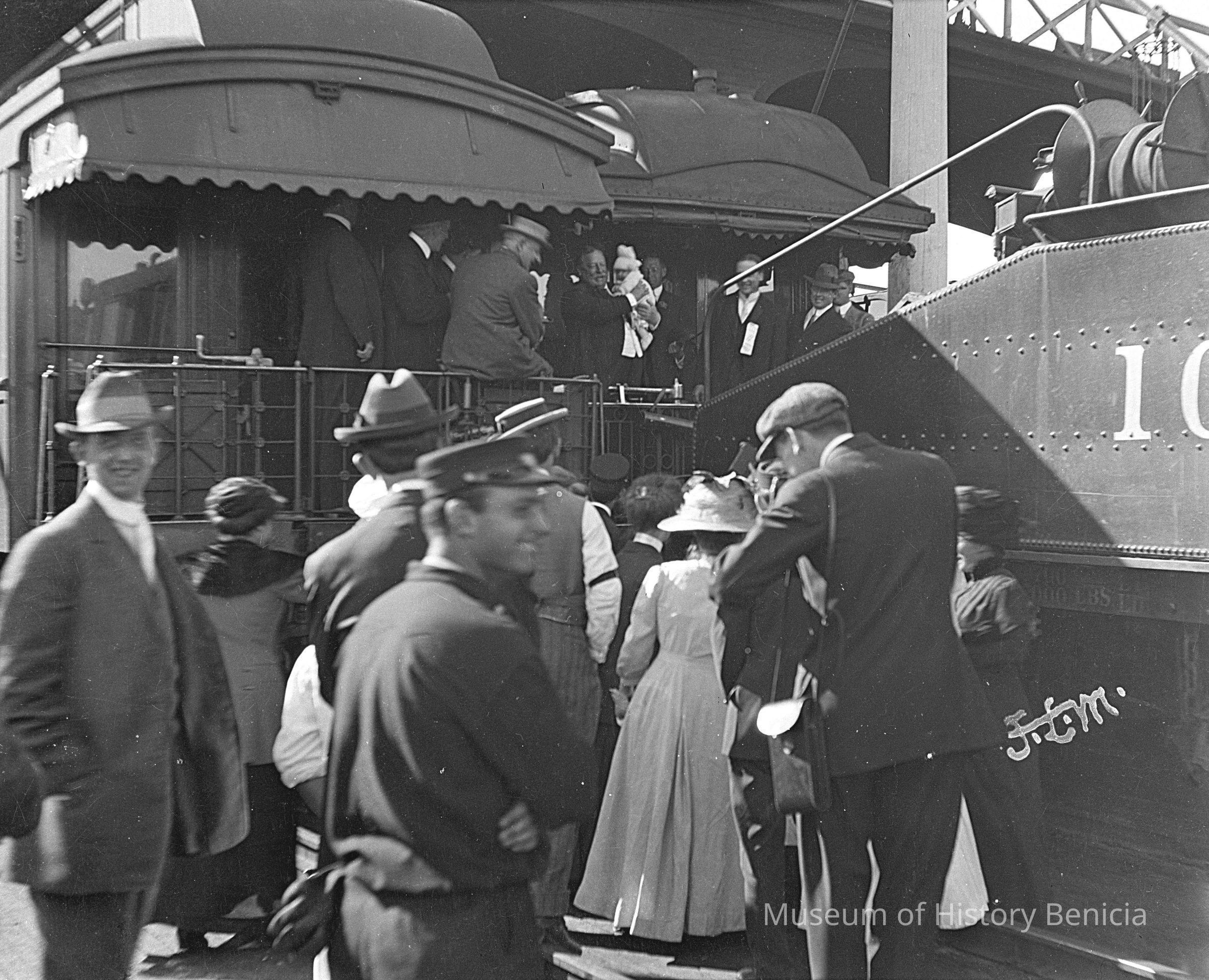 Pres. William Howard Taft in Martinez. Taft made at least two trips out West. One in 1909 and one in 1911/1912 which brought him to SF for ground breaking for the Panama- Pacific Expo. Photo has "JLM" initials on it. Taft is holding a baby. Others in the party are Governor Hiram Johnson and Congressman William Knowland.