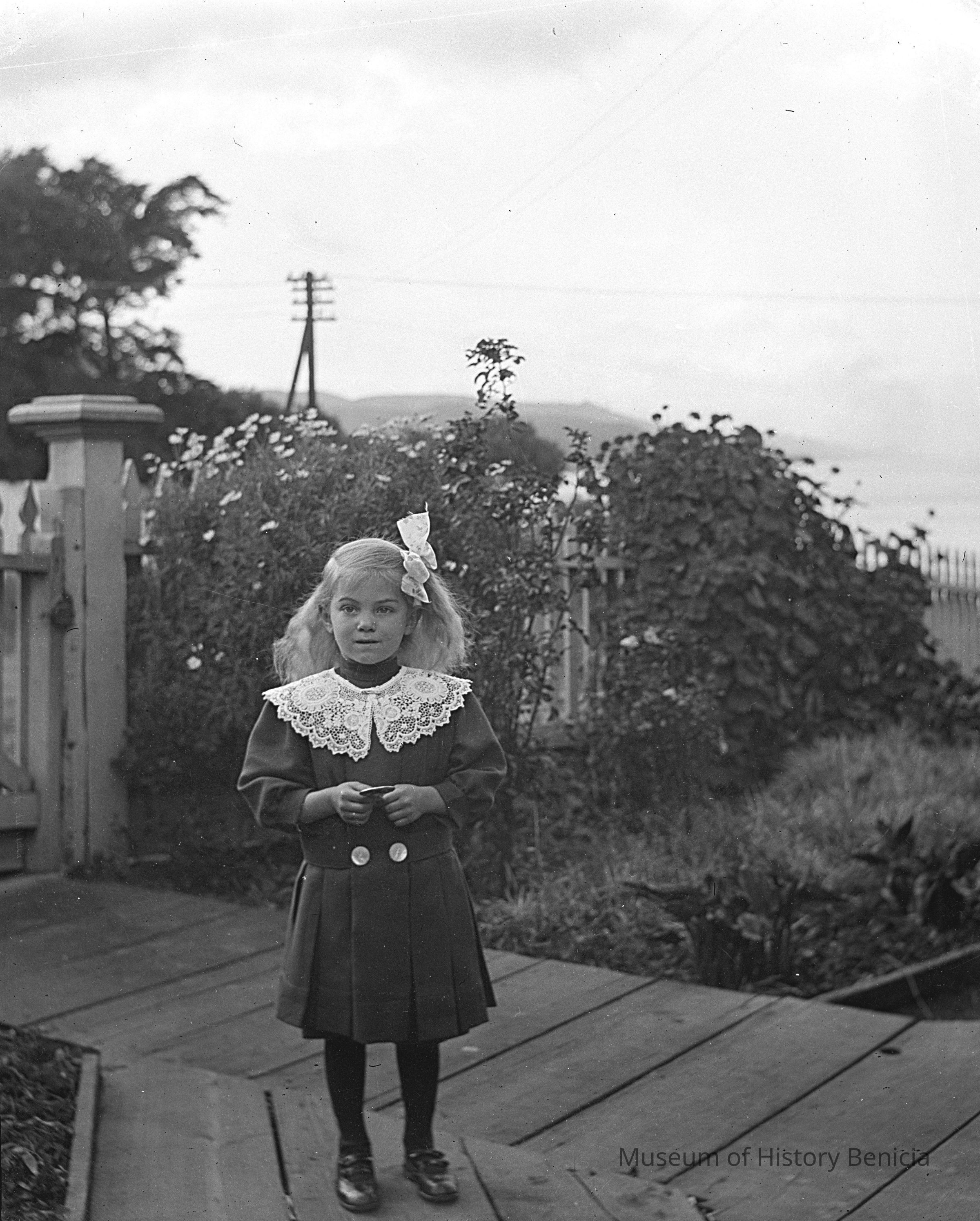 A little girl standing on a deck. She is wearing a skirt and blouse with a lace collar. the girl is Violet Molfino.