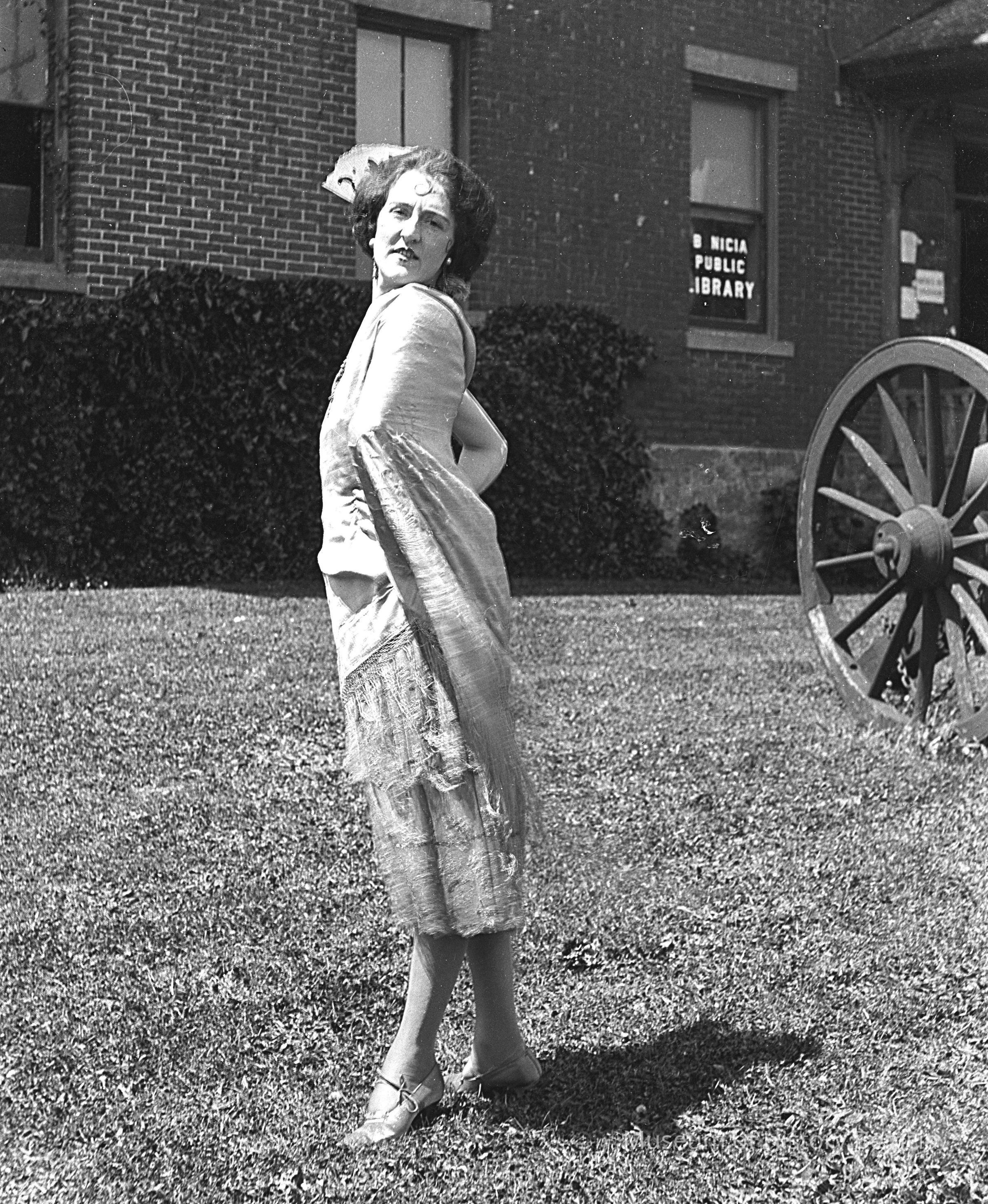 A teenage girl posing (with flare) on the side lawn of the Capitol Building (then being used as the Public Library). The girl was probably in the 1923 Solano County history pageant.Collection