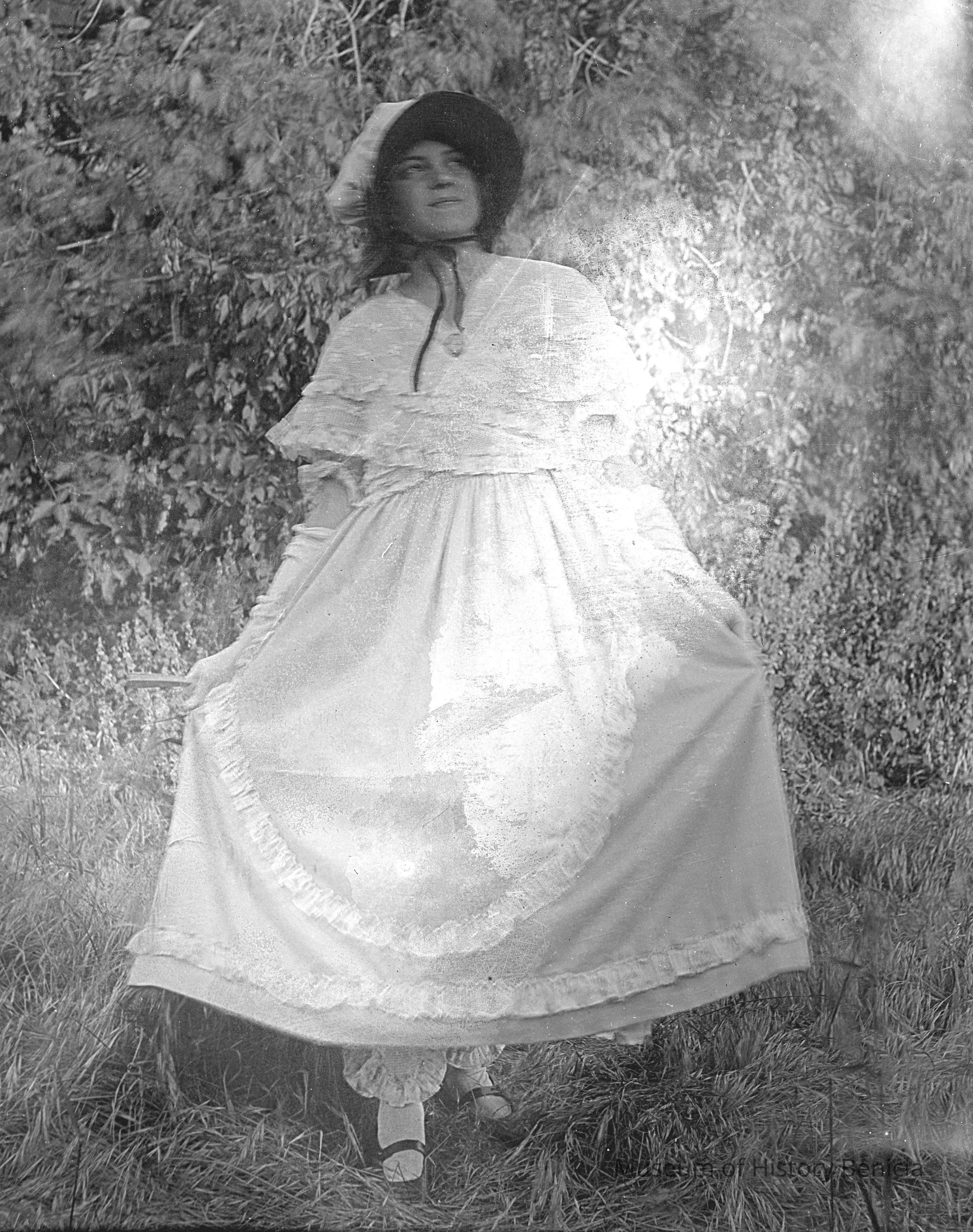 A girl dressed in a long dress, she is holding the skirt in her hands and flaring in out to the sides.