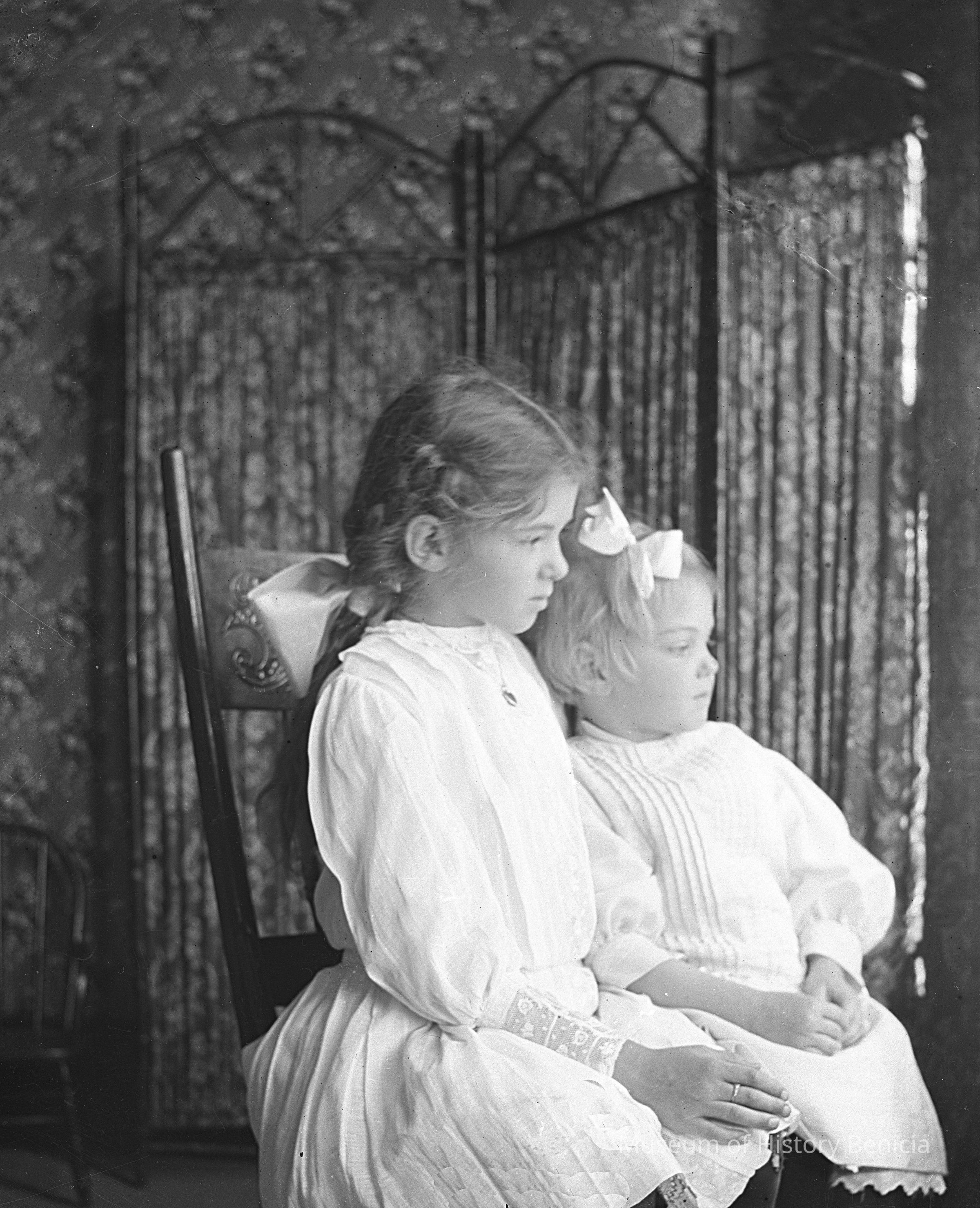 Two young girls sitting in a chair together. The girls are Margurite (left) and Violet (right) Molfino.