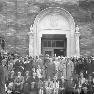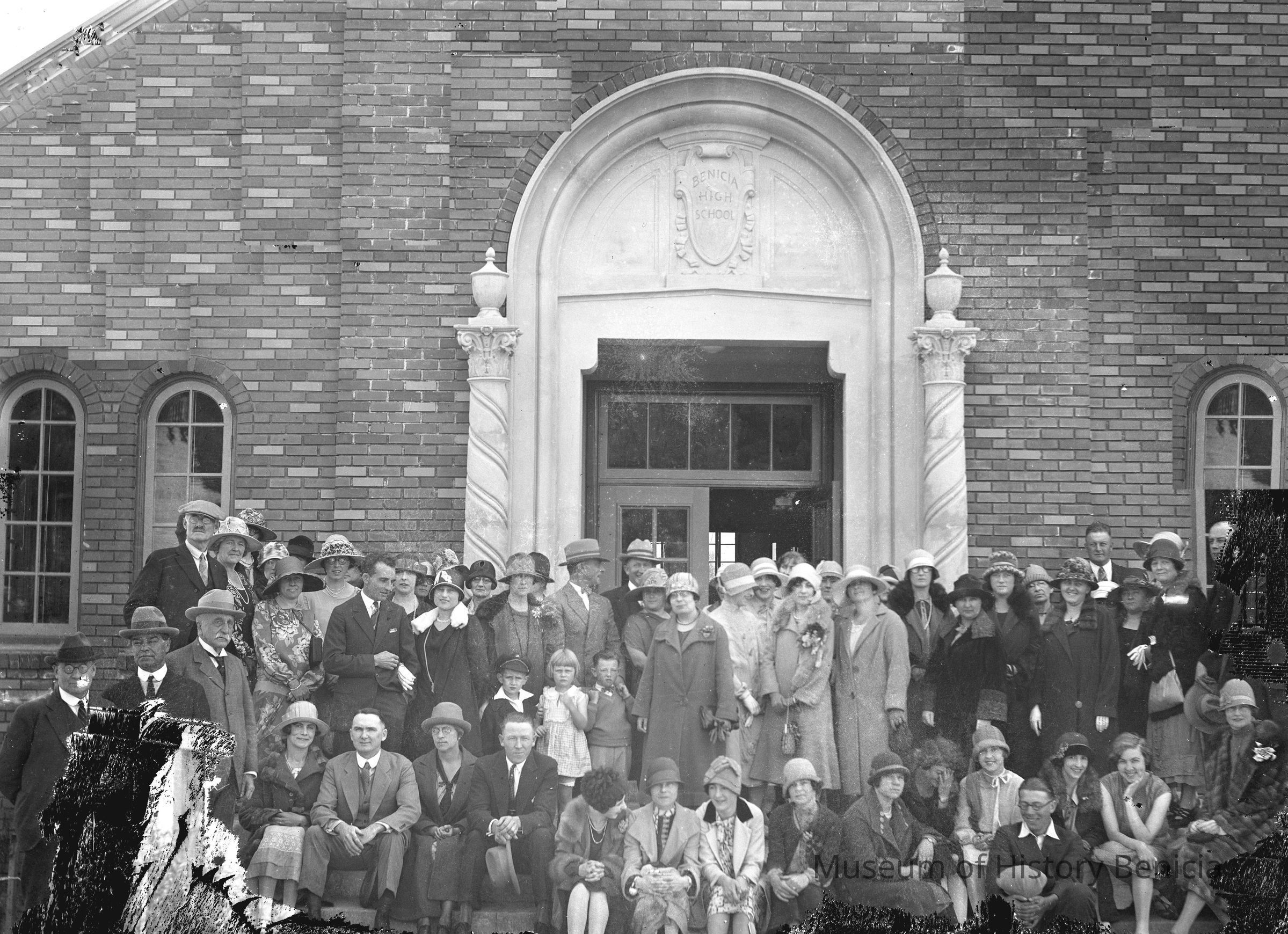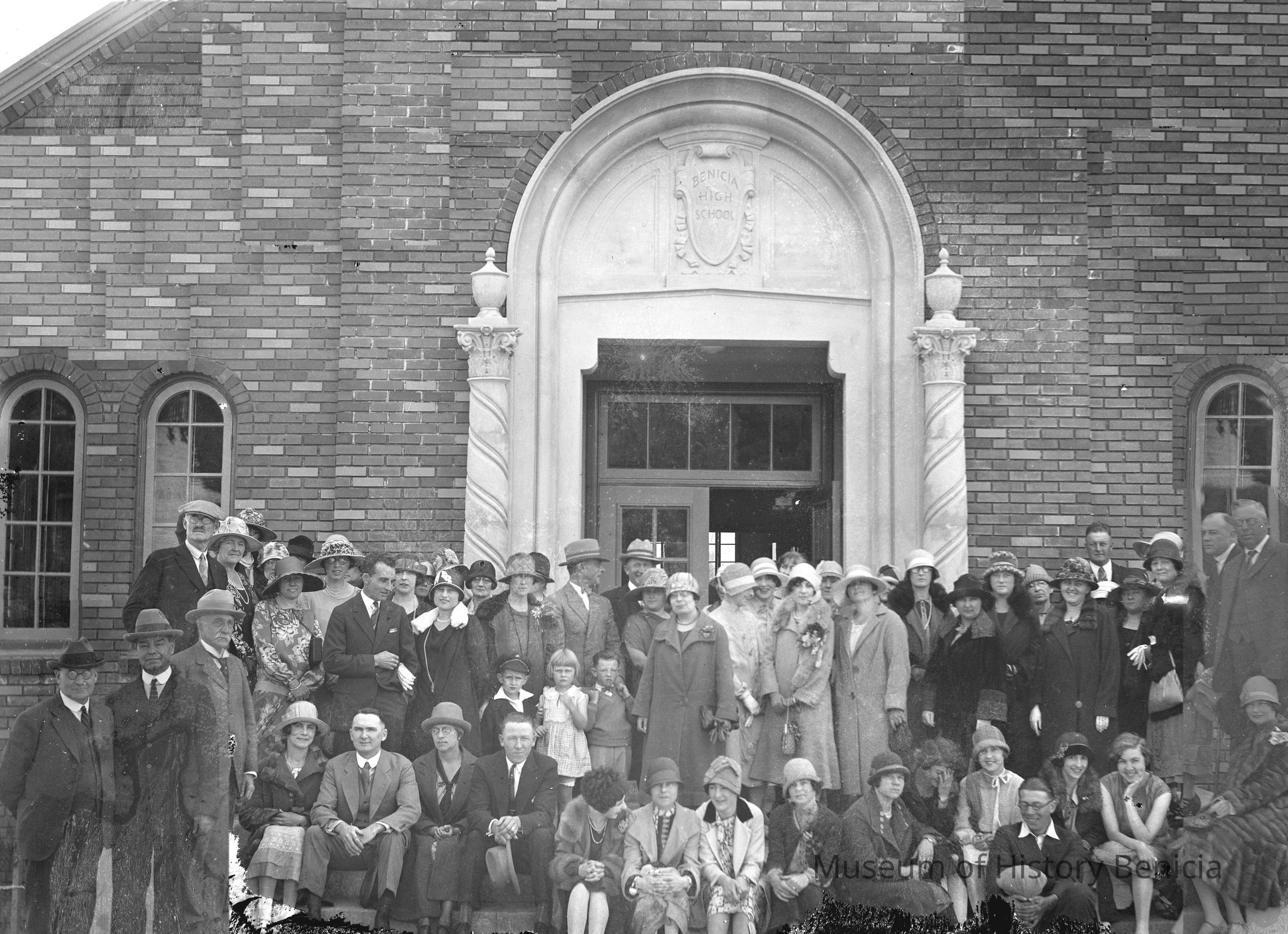Group of men and women outside of Benicia High School (faculty or students?). This may be a photo taken in 1926 when they had a class reunion party at the "new" high school. (per Earl Bobitt.)The (former) Benicia High School. Now City Hall and Police Station. Built between 1924-1926.