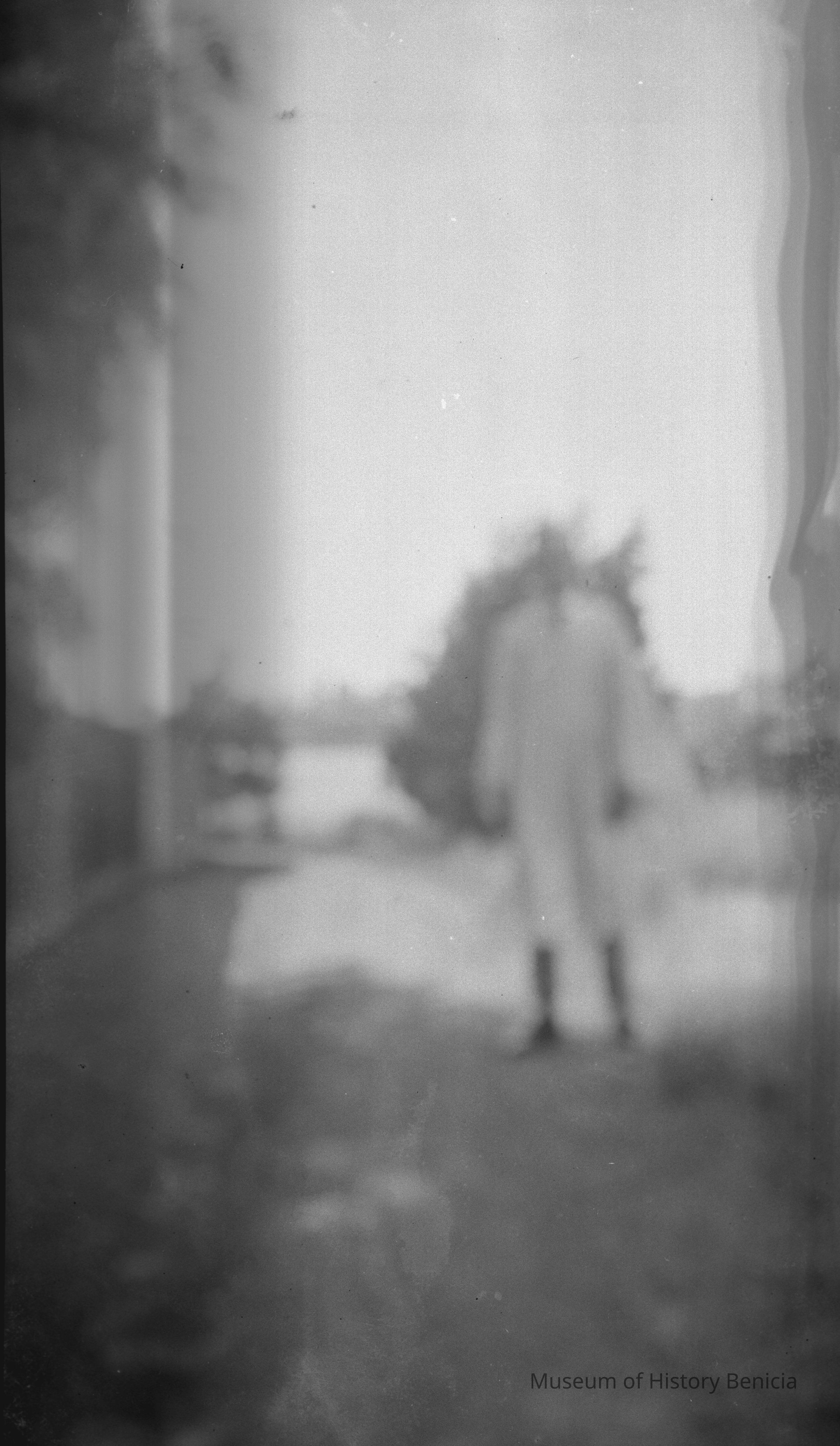 Man/woman standing next to Commandants Residence (?) or other house. Photo is very blurry and dark.