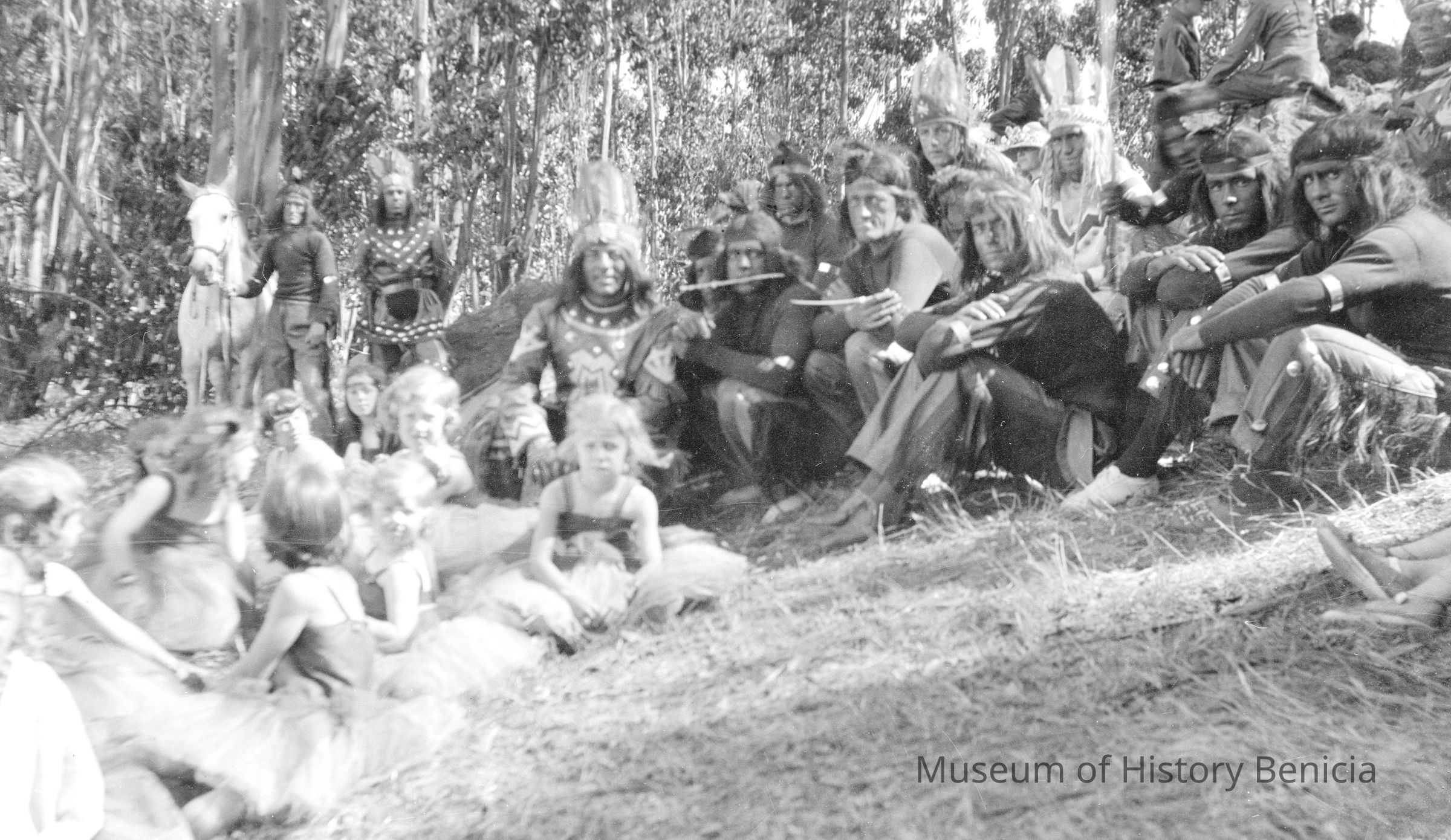 A group of young girls sitting with a group of men dressed like Native Americans (the Redmen?). Probably participants for the Solano History Pageant of 1923 at Alma Pometta ranch.Collection