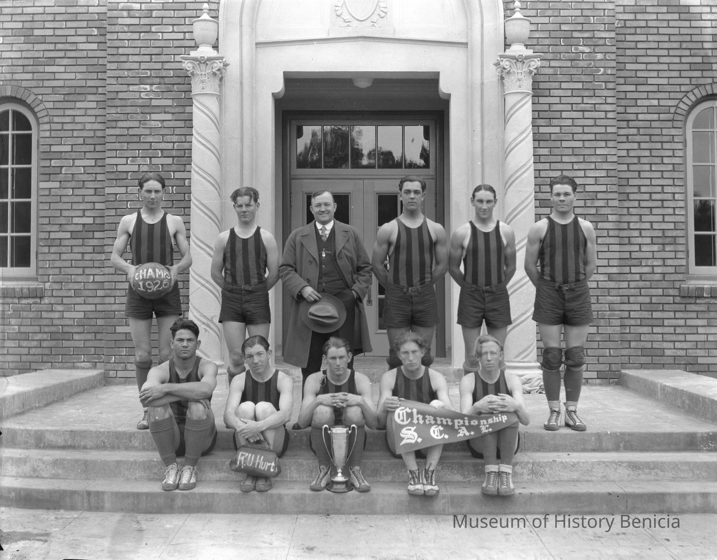 This is part of the Benicia High School team that won the first Solano County Athletic League (SCAL) championship in 1926 (see newspaper articles in 2004.001.0377). Newspaper says coach is Gosset (J.O. Gossett who was the principal that Earl Bobitt says retired as principal in 1926?) Names mentioned in various newspaper articles for 1926 Benicia Bullets basketball team are: