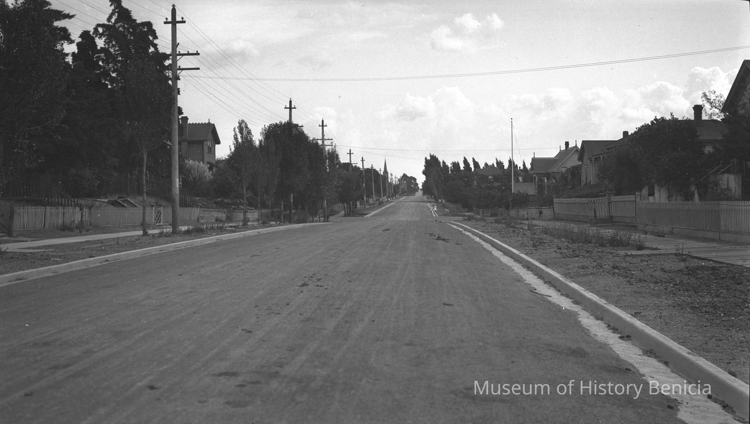 Looking down a street with houses on either side. 100 block of West "J" street in Benicia with Congregational church at the end. The view is from 2nd street towards 1st street.Collection