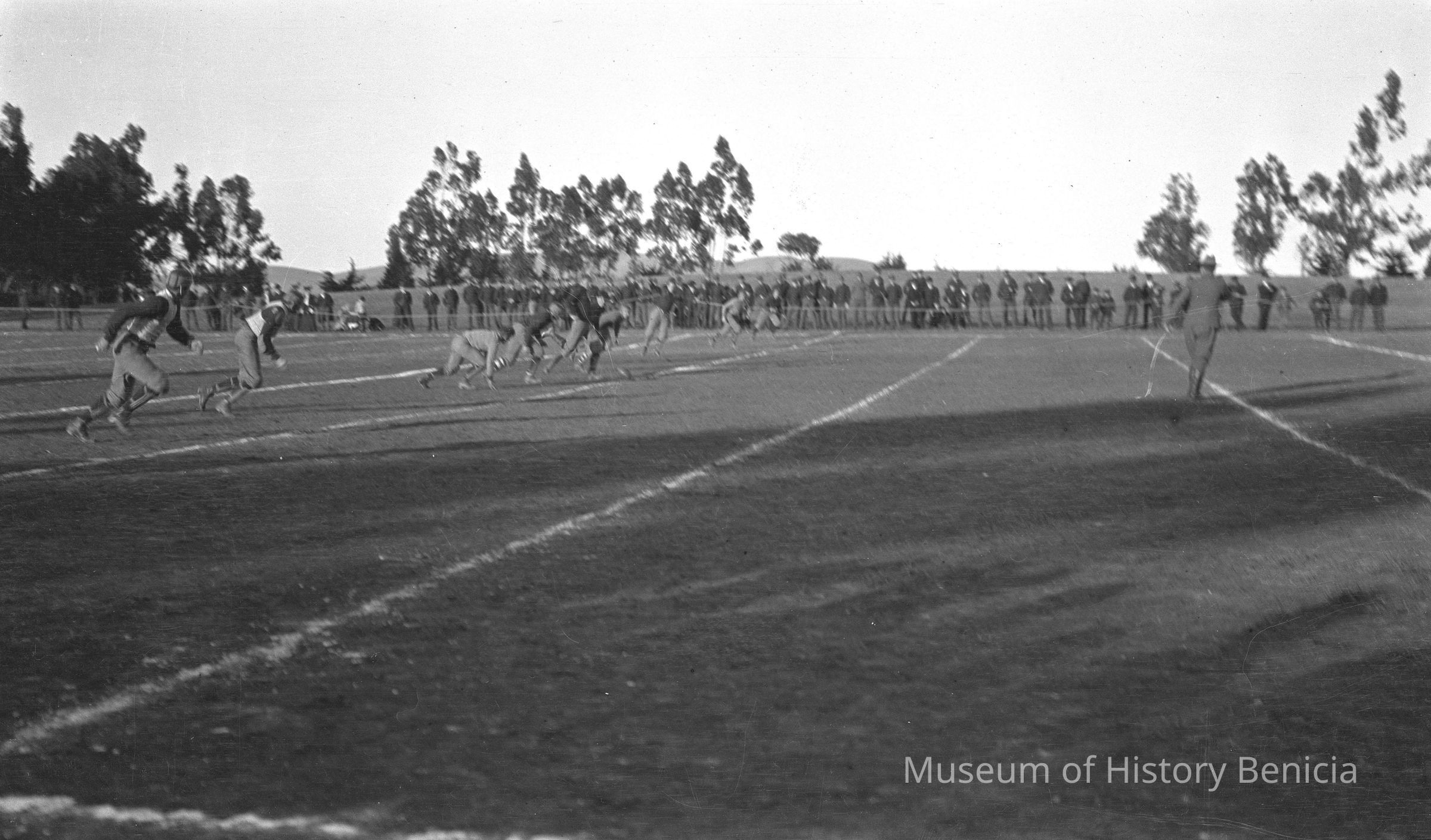 A football game. Football game Benicia Town Boys vs. Arsenal Signal Corps Thanksgiving 1905 or New Years 1906 in progress. In the Arsenal.