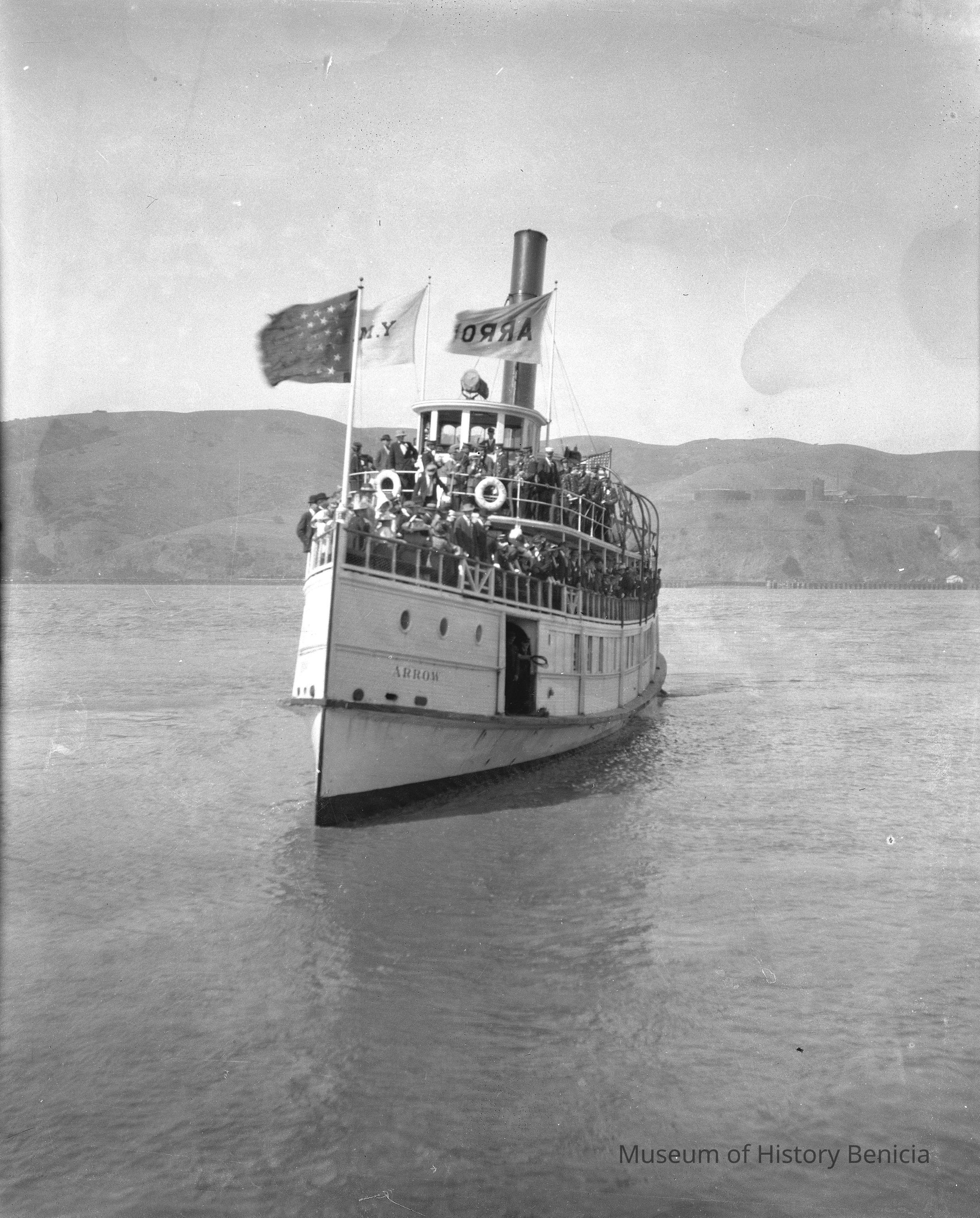 A large ship named "Arrow" on the bay. There are lots of people on board and there is a farm with a silo and several large tanks (water/oil?) in the background. The flags on the ship are for the YMI (Young Men's Institute?).Collection