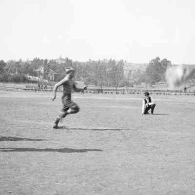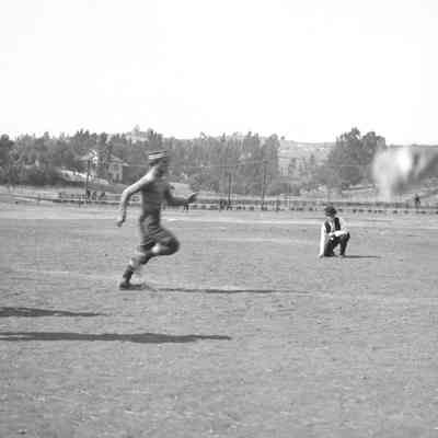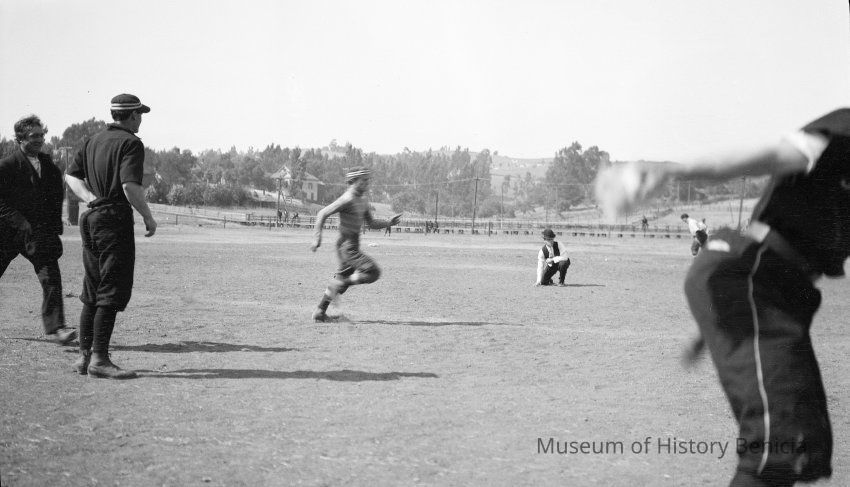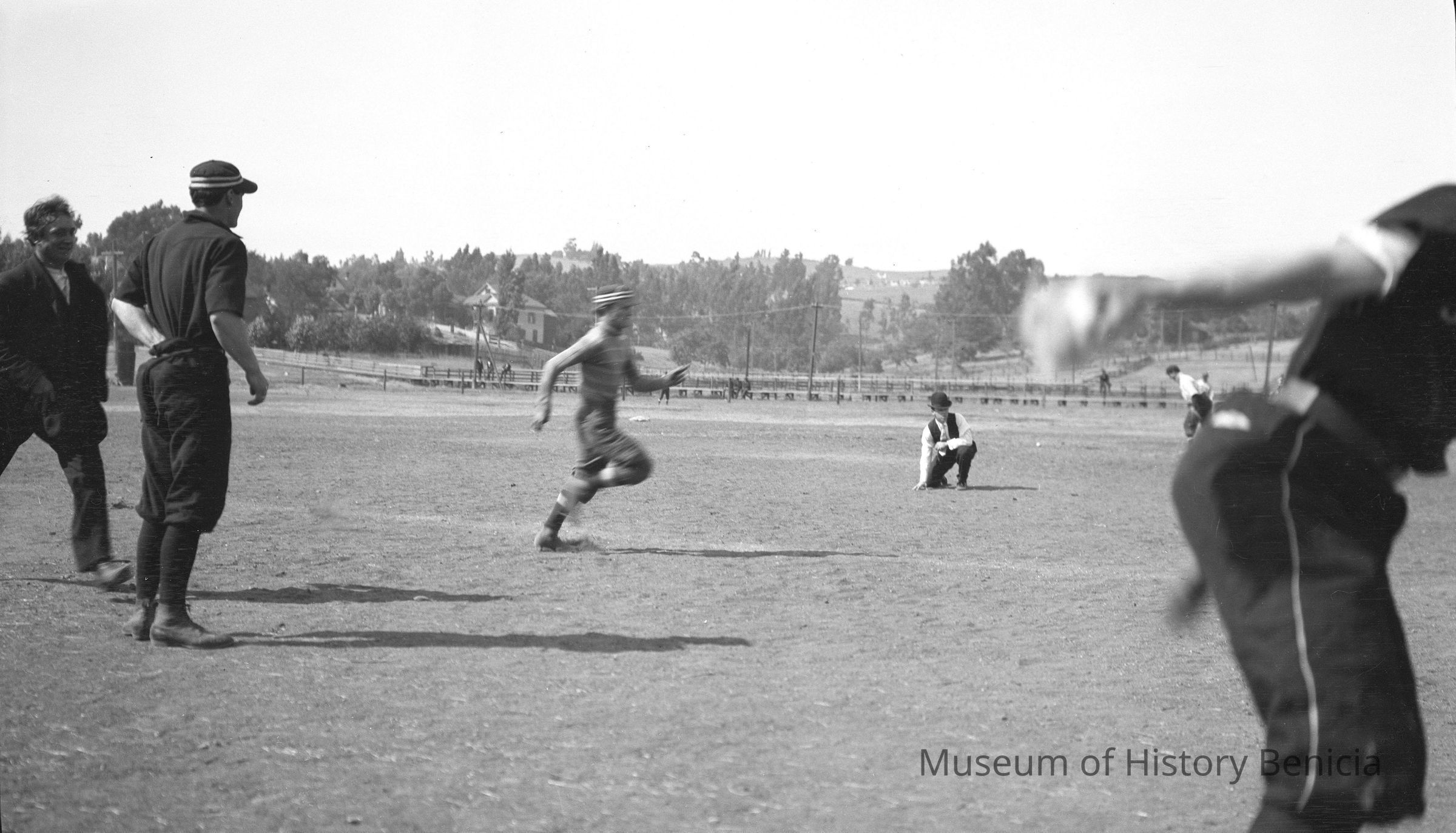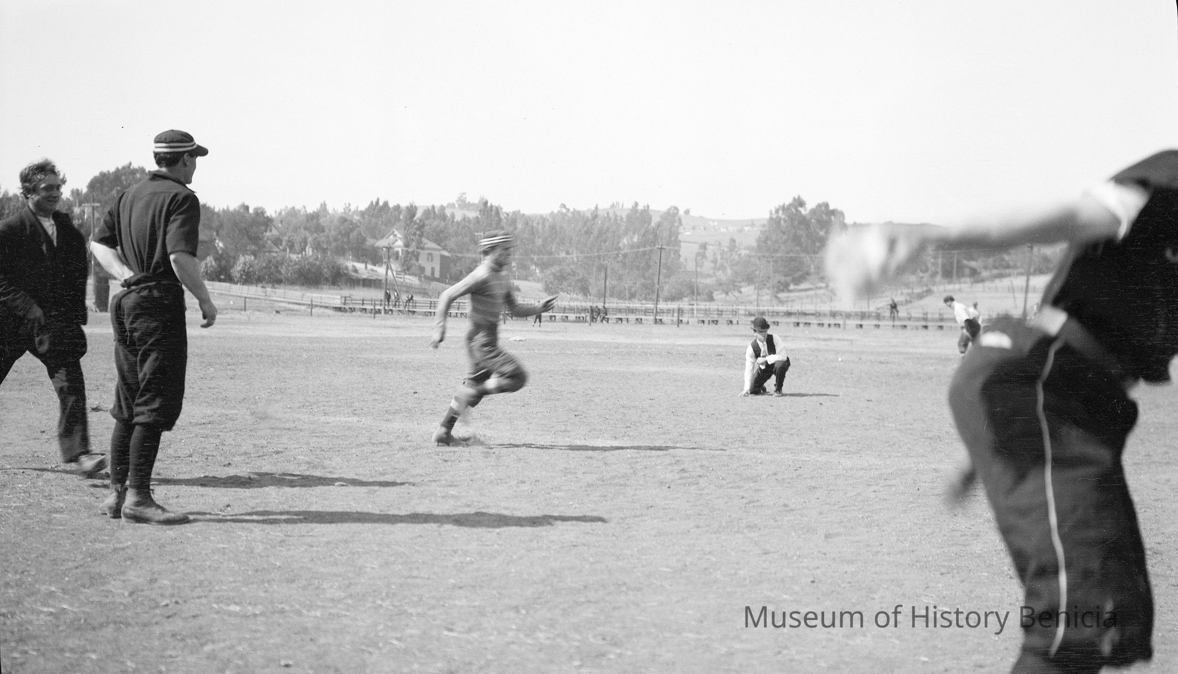 Baseball game August 26th, 1906 at Fitzgerald field, Benicia. The players in the dark uniforms are the "Glendon's" from Benicia. They are sponsored by J E Glendon a local businessman who owned a clothing store. The other team are the "Allan Dry Goods Co." team from San Francisco, Ca. The final score was 4 to 3 in favor of the home team (Glendon's).