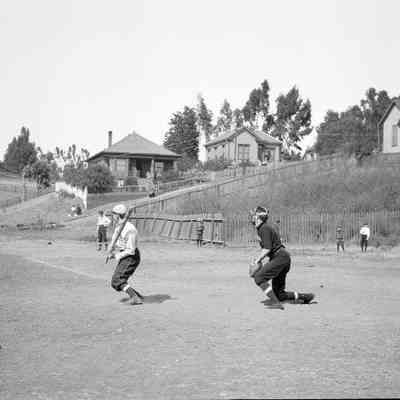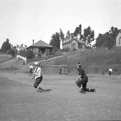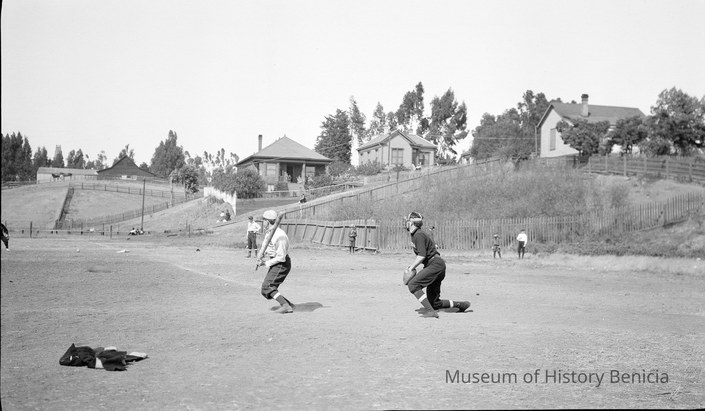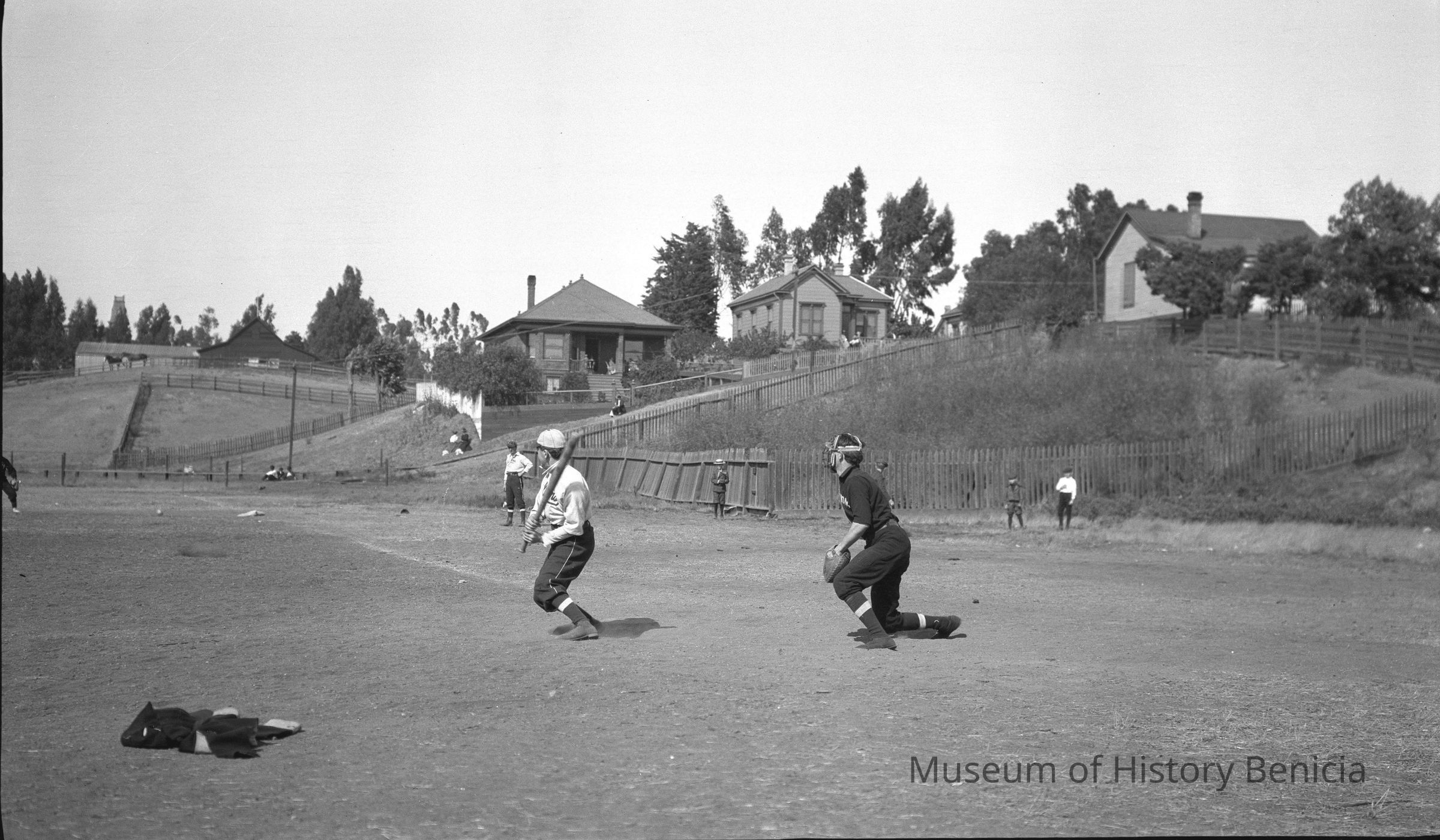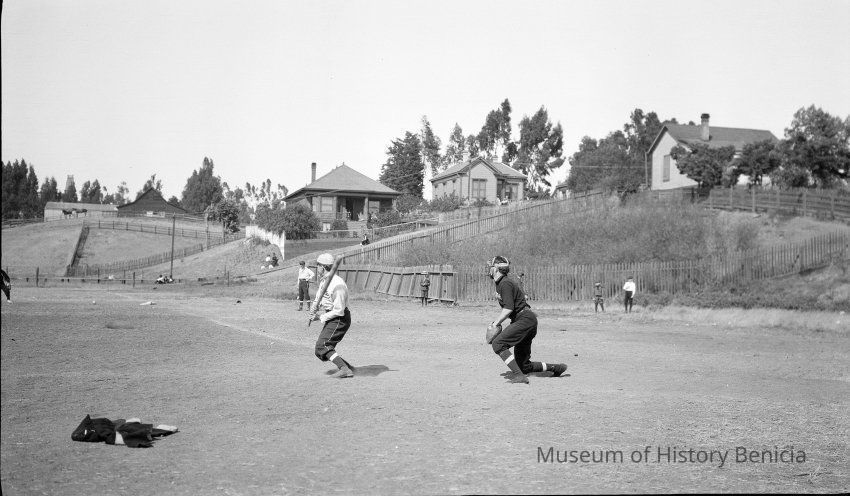 Baseball game August 26th, 1906 at Fitzgerald field, Benicia. The players in the dark uniforms are the "Glendon's" from Benicia. They are sponsored by J E Glendon a local businessman who owned a clothing store. The other team are the "Allan Dry Goods Co." team from San Francisco, Ca. The final score was 4 to 3 in favor of the home team (Glendon's).