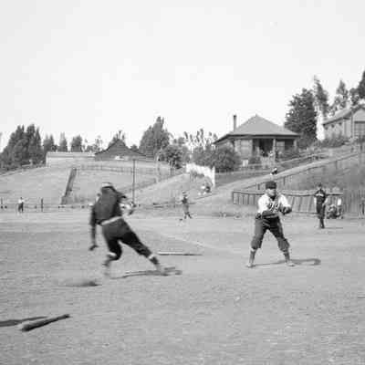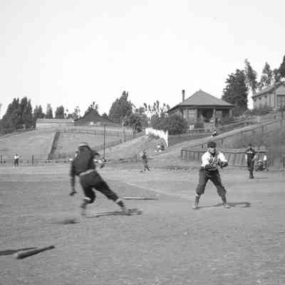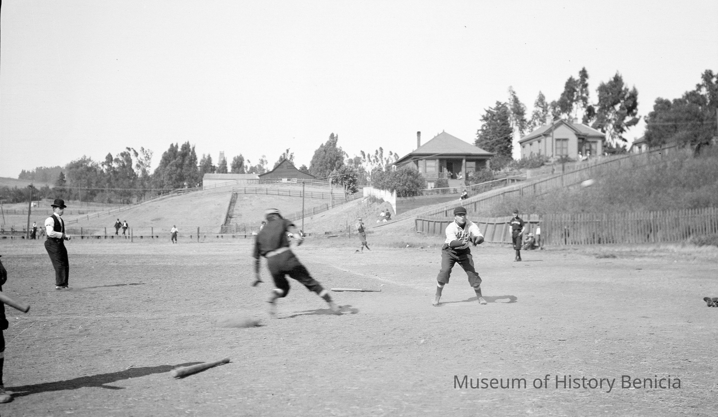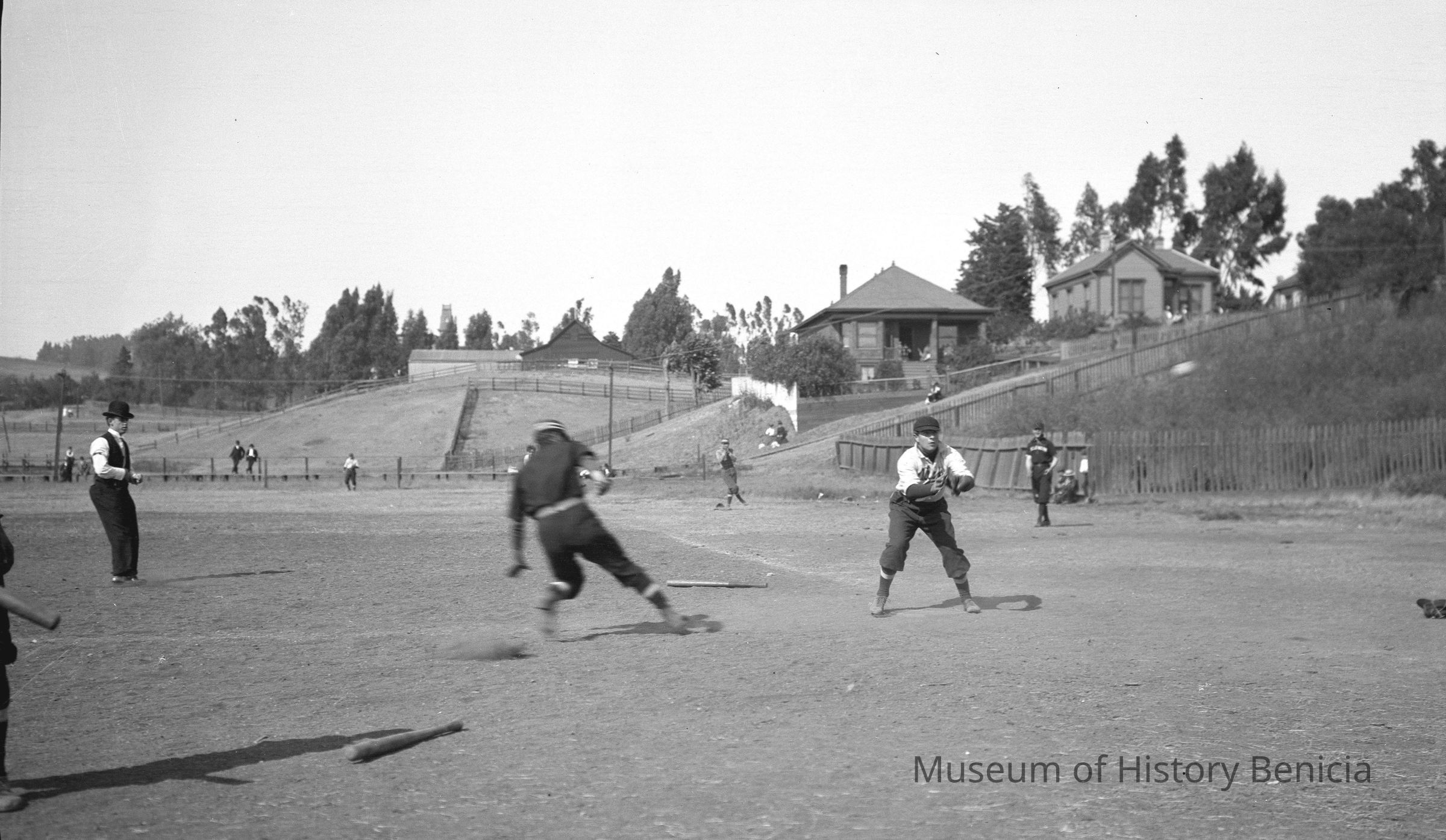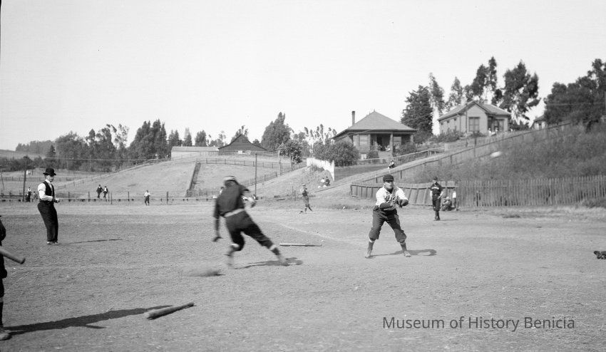 Baseball game August 26th, 1906 at Fitzgerald field, Benicia. The players in the dark uniforms are the "Glendon's" from Benicia. They are sponsored by J E Glendon a local businessman who owned a clothing store. The other team are the "Allan Dry Goods Co." team from San Francisco, Ca. The final score was 4 to 3 in favor of the home team (Glendon's).