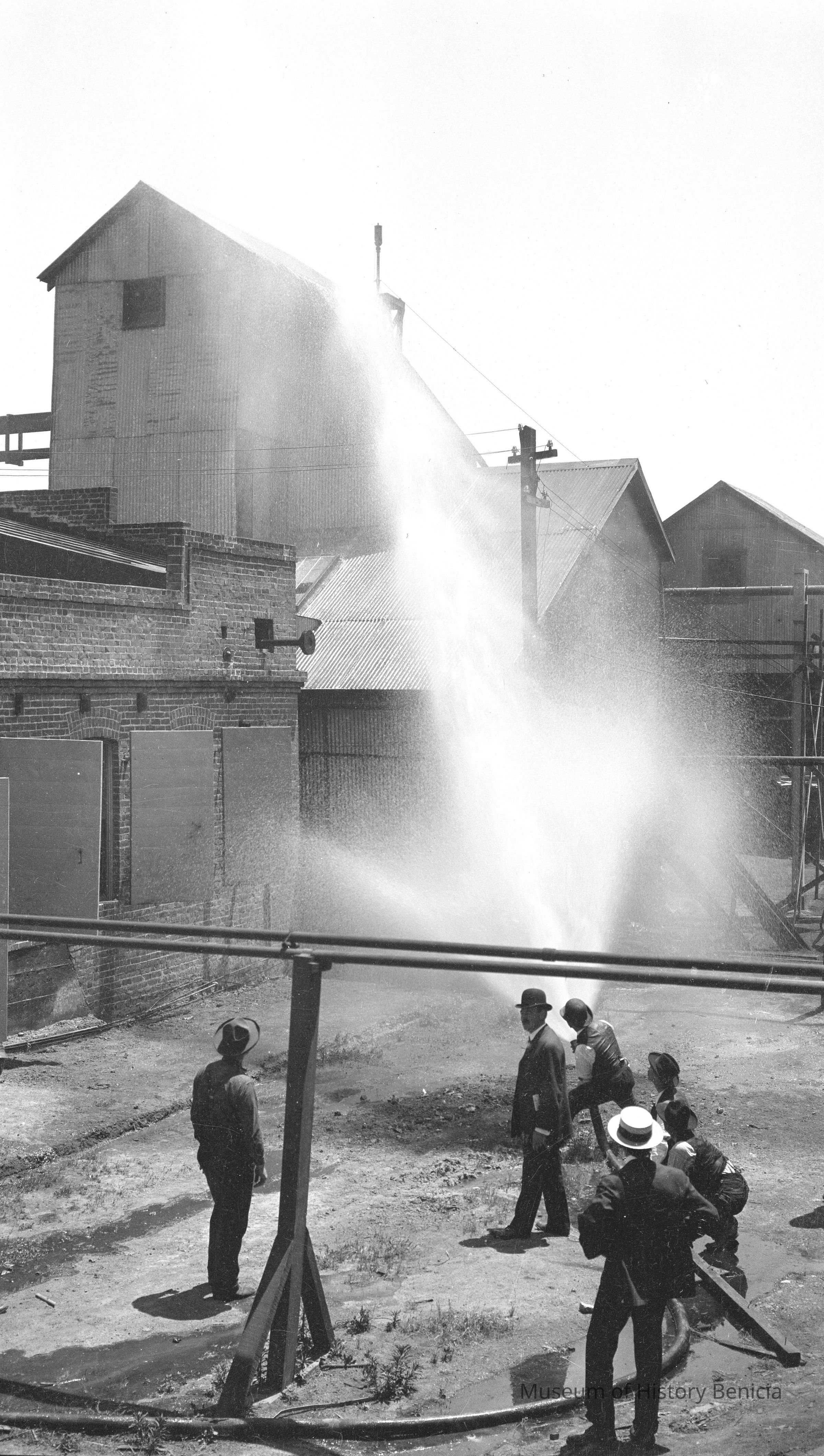 Benicia Fire Department Drill July 1906. Using firehoses at the Benicia Tannery buildings.