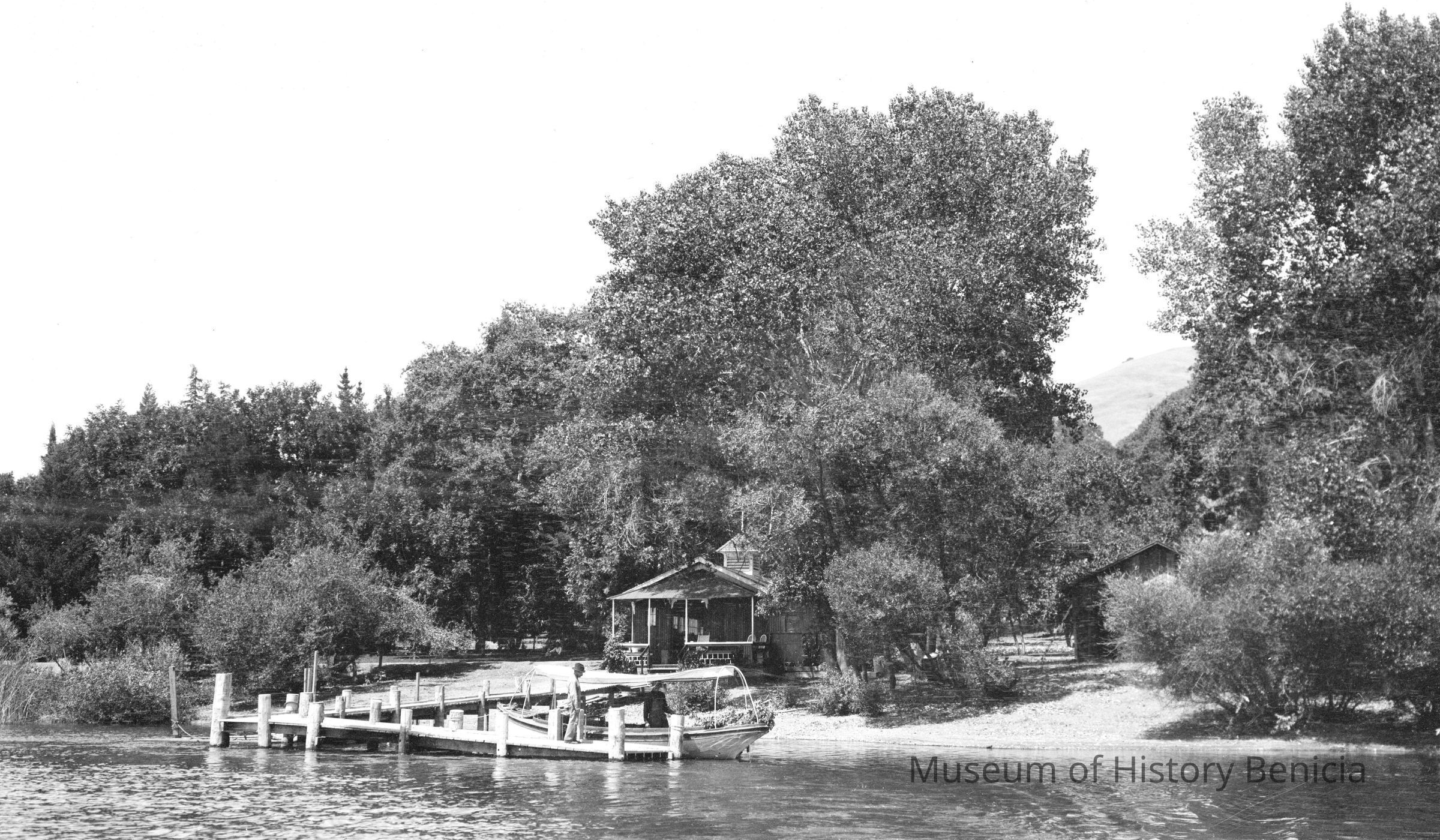 Saratoga Springs vacation. House with boat dock and boat next to lake. Some people next to boat.