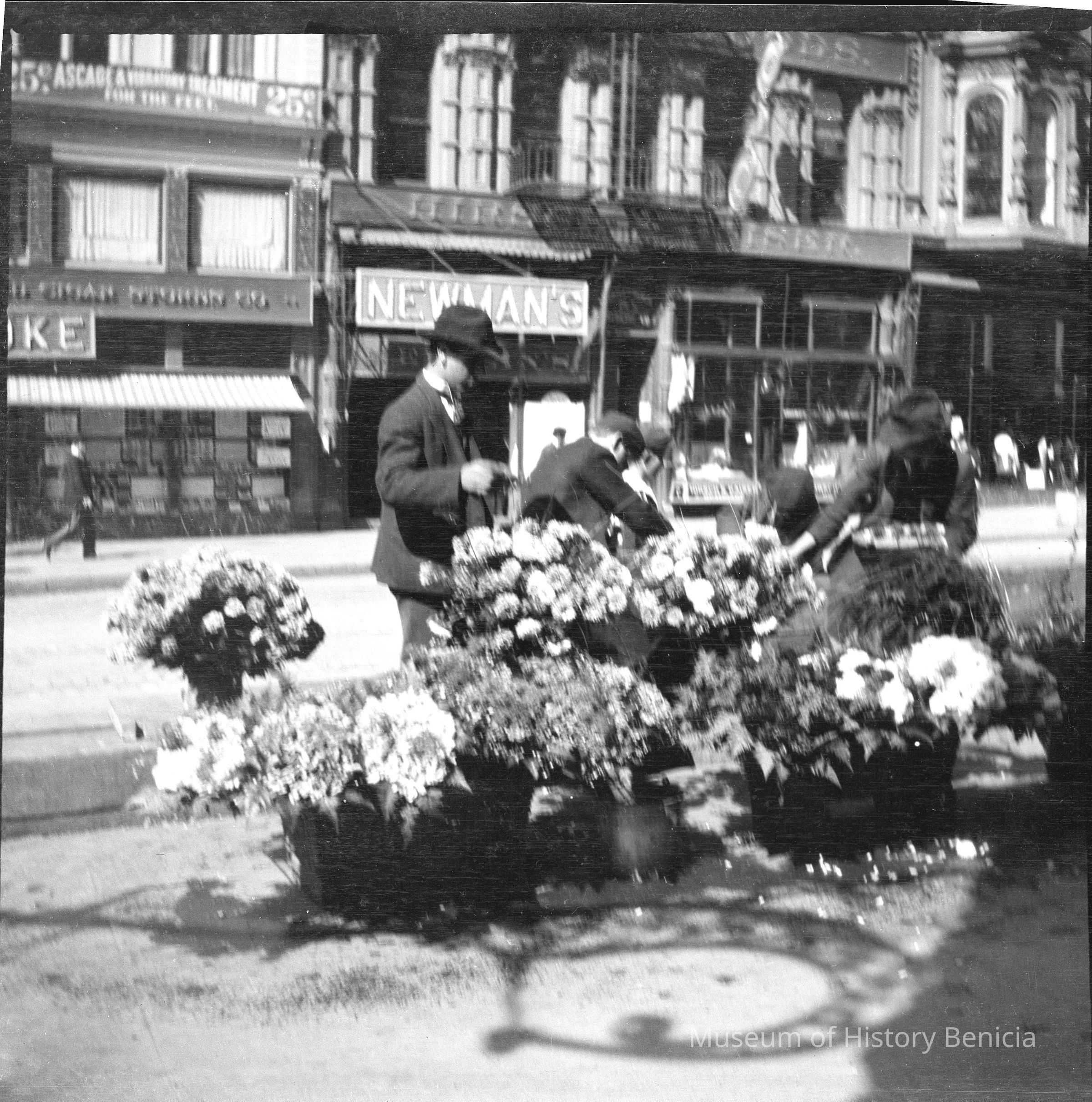 San Francisco before the earthquake and fire of 1906. SF before the fire. Flower vendor in front of building that says Newmans.