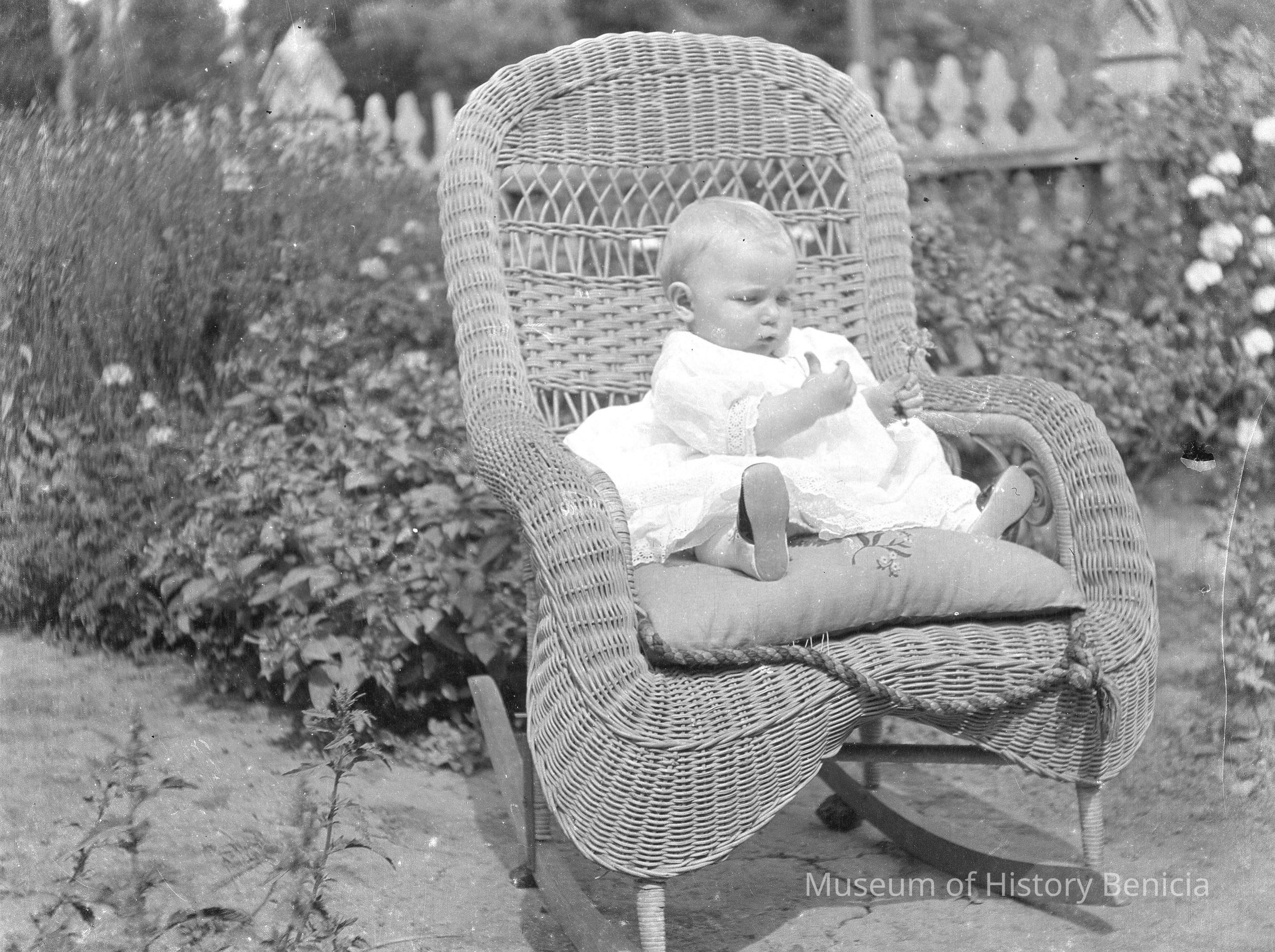 A baby sitting in a wicker chair.