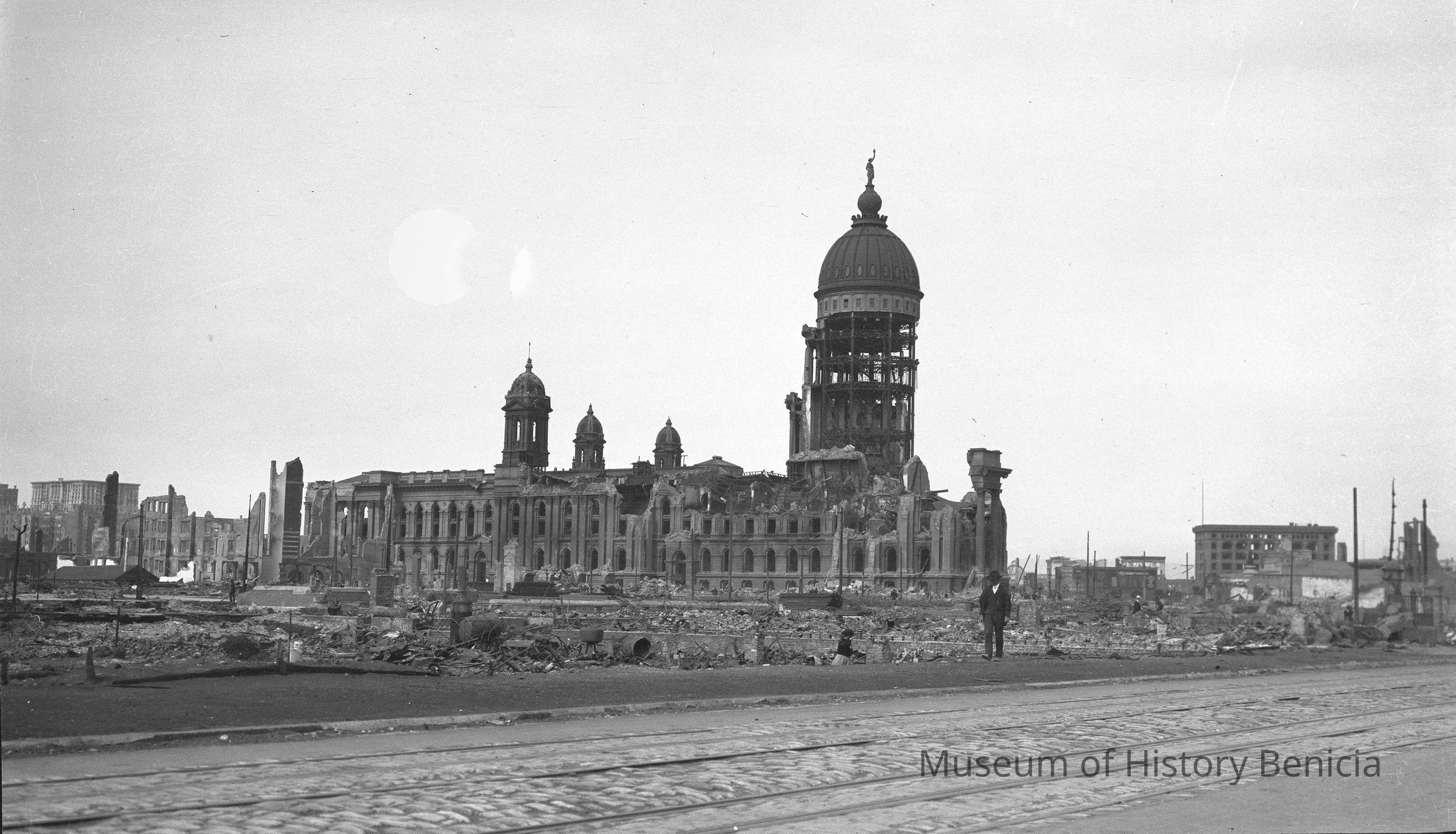 City Hall, San Francisco after the earthquake of 1906. 1906 SF Earthquake. City Hall from across the street. A man in front of the church.