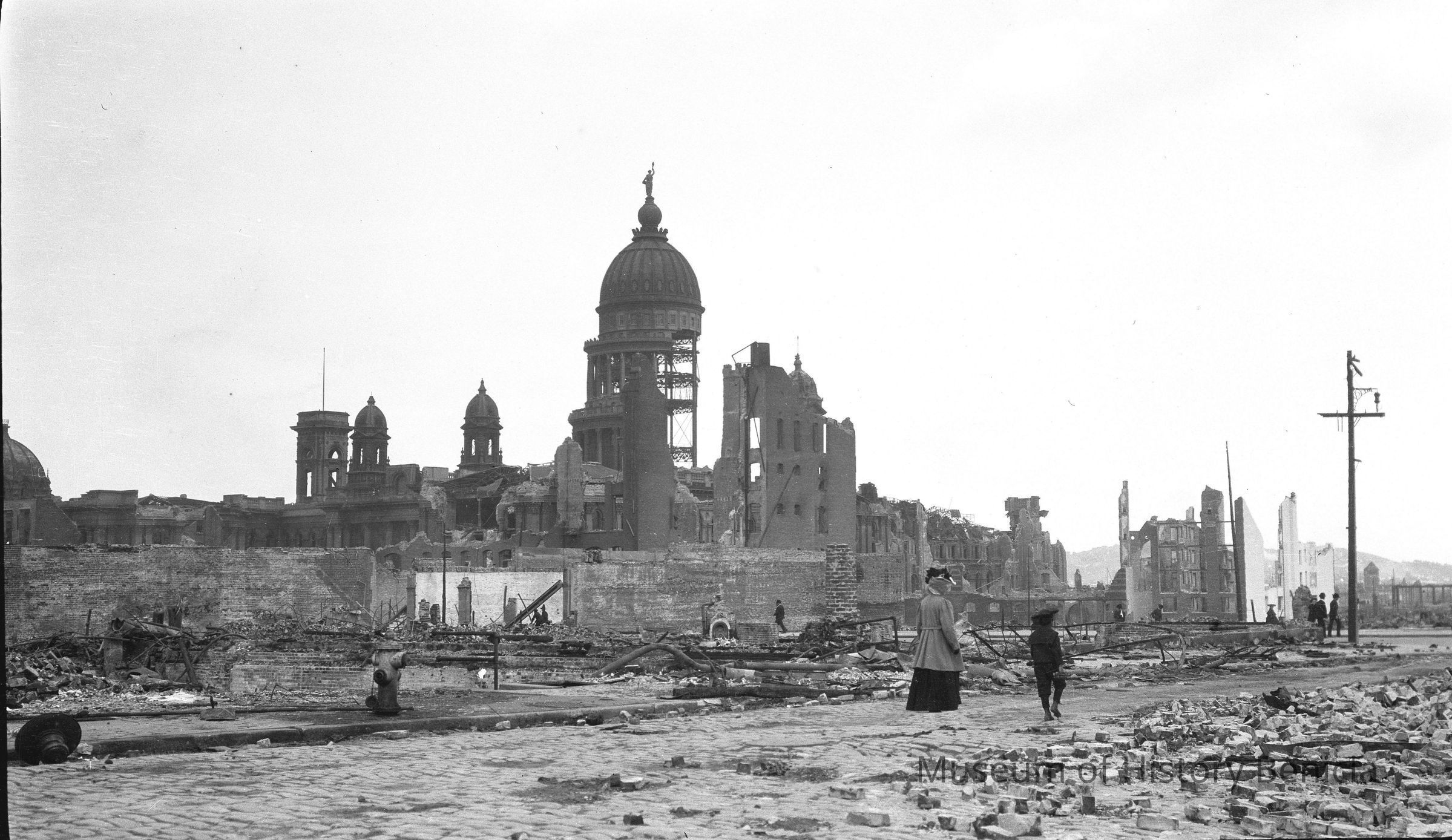 City Hall, San Francisco after the earthquake of 1906. Woman and boy walking along street.