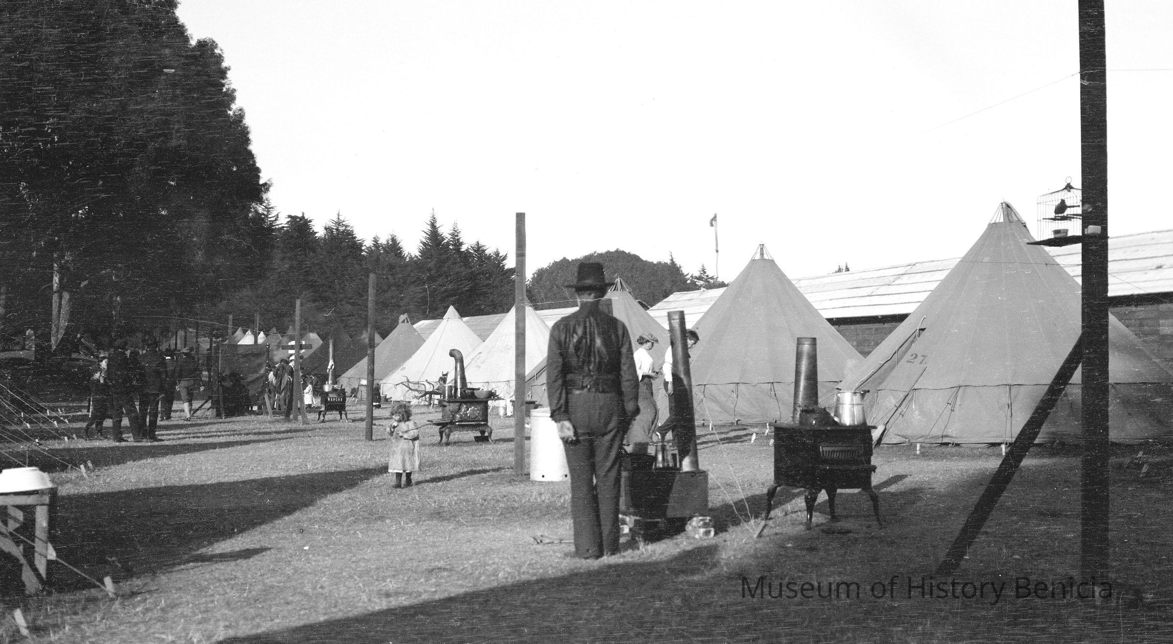 Refugee camp, San Francisco. 1906 SF earthquake refugee camps. People walking around and a little girl eating in foreground.