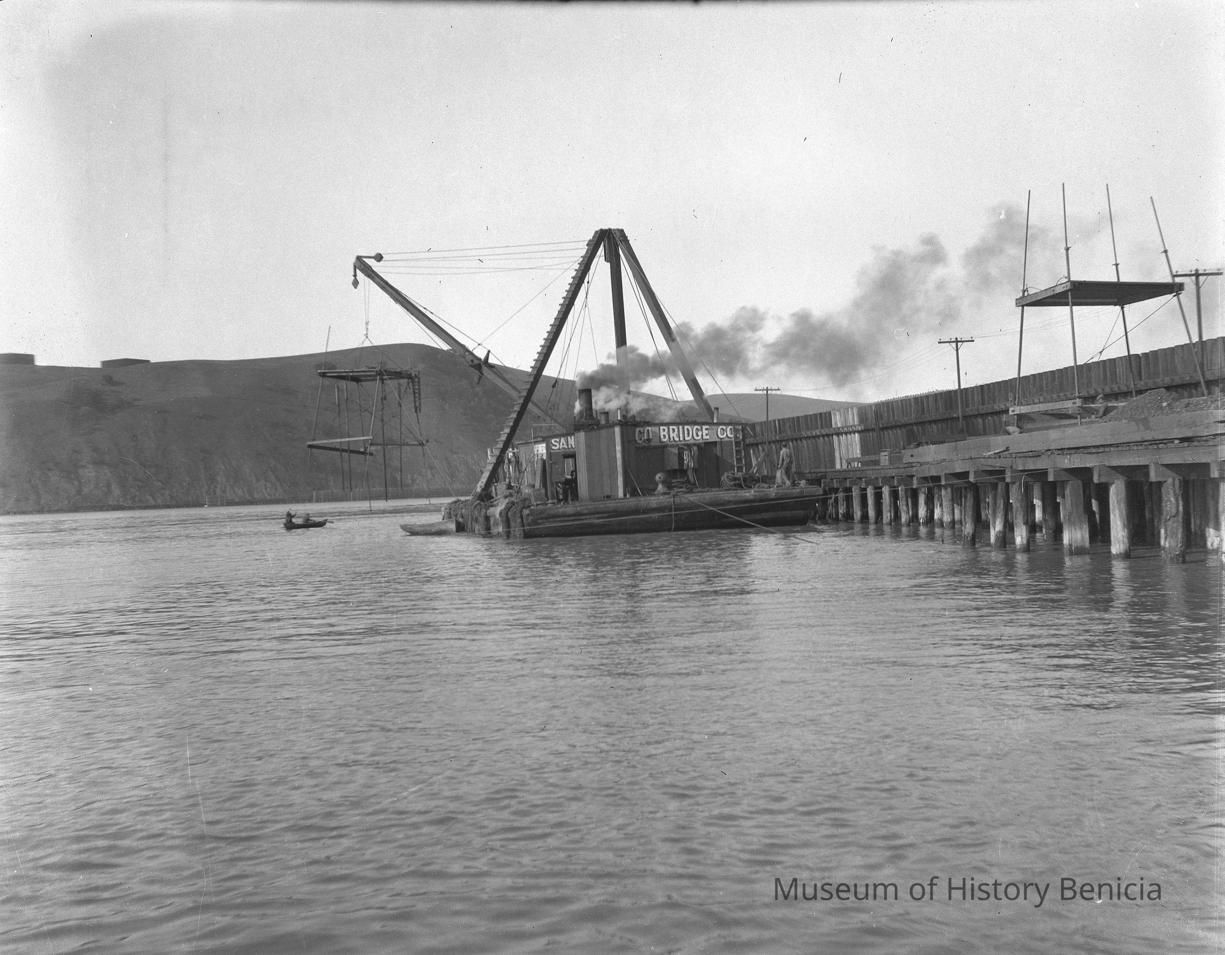 A boat next to a pier. This photo shows the San Francisco Bridge Company doing work off the Benicia railroad yard. This probably was in 1931 when the city contracted to have the slips of the Southern Pacific Company dismantled and to clear the waterfront of all piling pertaining to the ferry boats.Collection