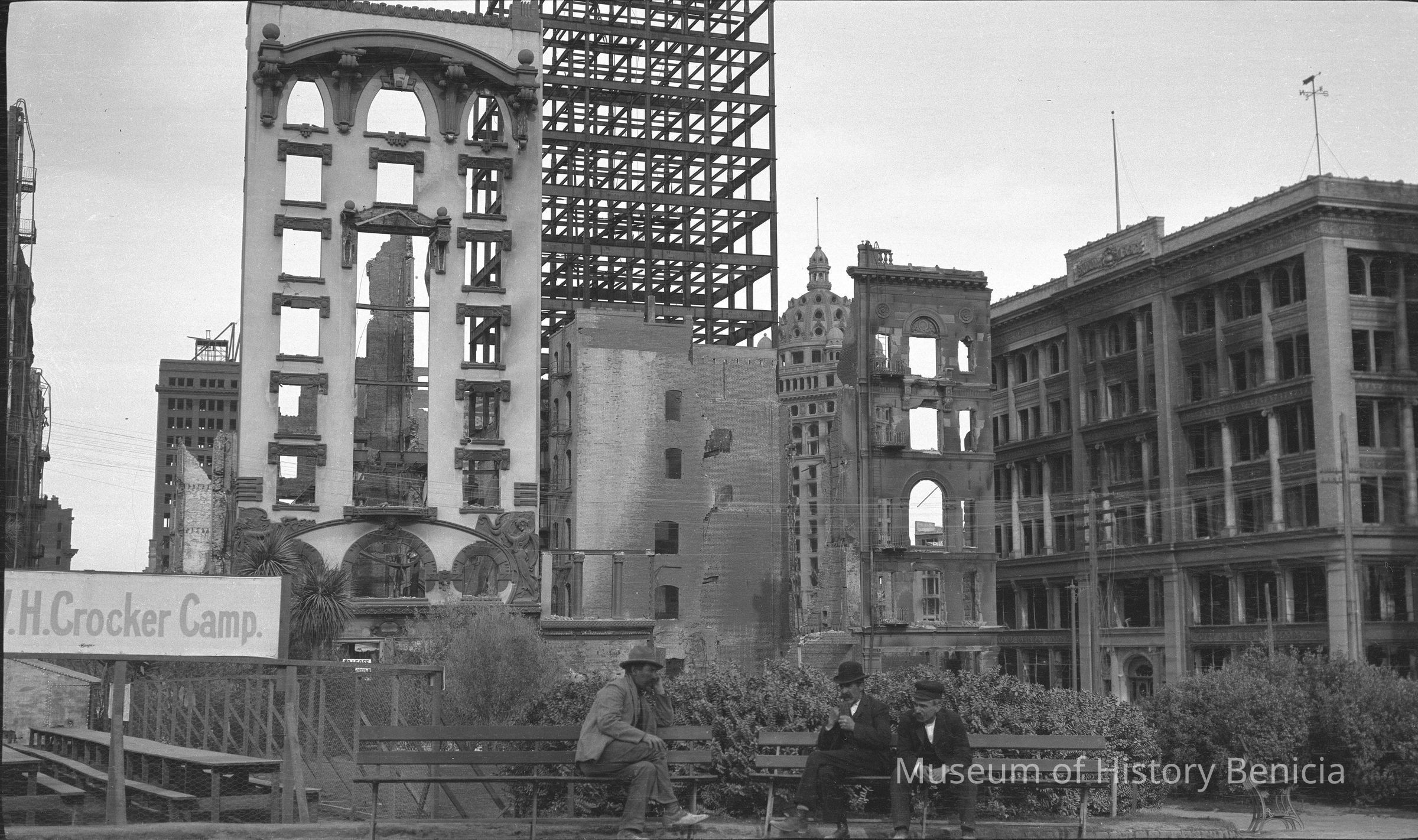 San Francisco, 1906. View of destroyed buildings from the earthquake and fire. 1906 San Francisco earthquake. Hall of Justice and other wrecks. Sign says WH Crocker Camp. This is the Mrs William H Crocker refugee camp in Union Square. Three guys sitting on a bench next to sign. In background is the steel structure of the Whittell Building - then known as the Union League Building - under construction at the time of the earthquake. The undamaged building in the background right of center is the Call building.Collection