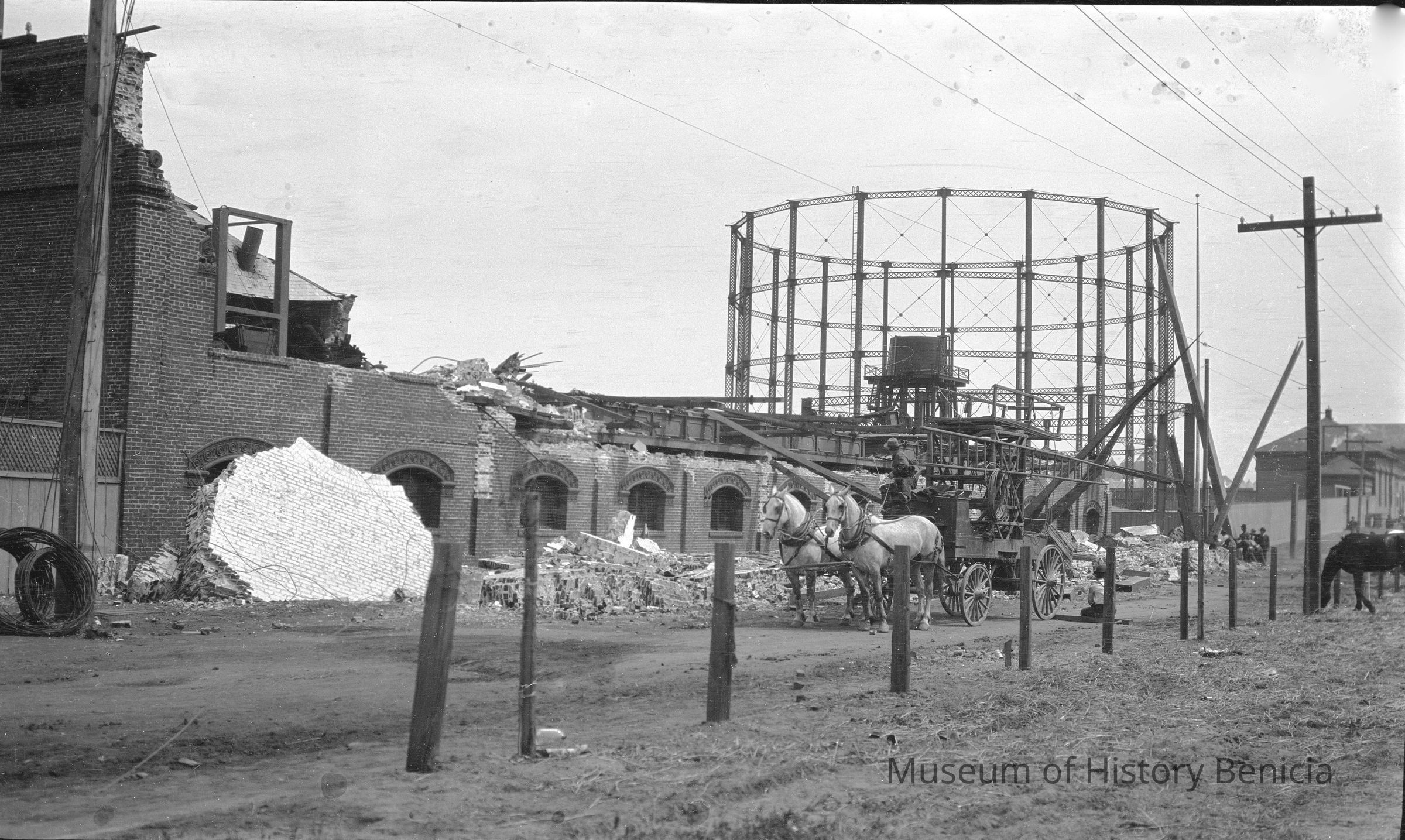 Gas Works, San Francisco. 1906 SF Earthquake Gas Works. Large chunks of fallen brick wall on the ground. Wagon trying to pull something (maybe the same post as in 1078).Collection