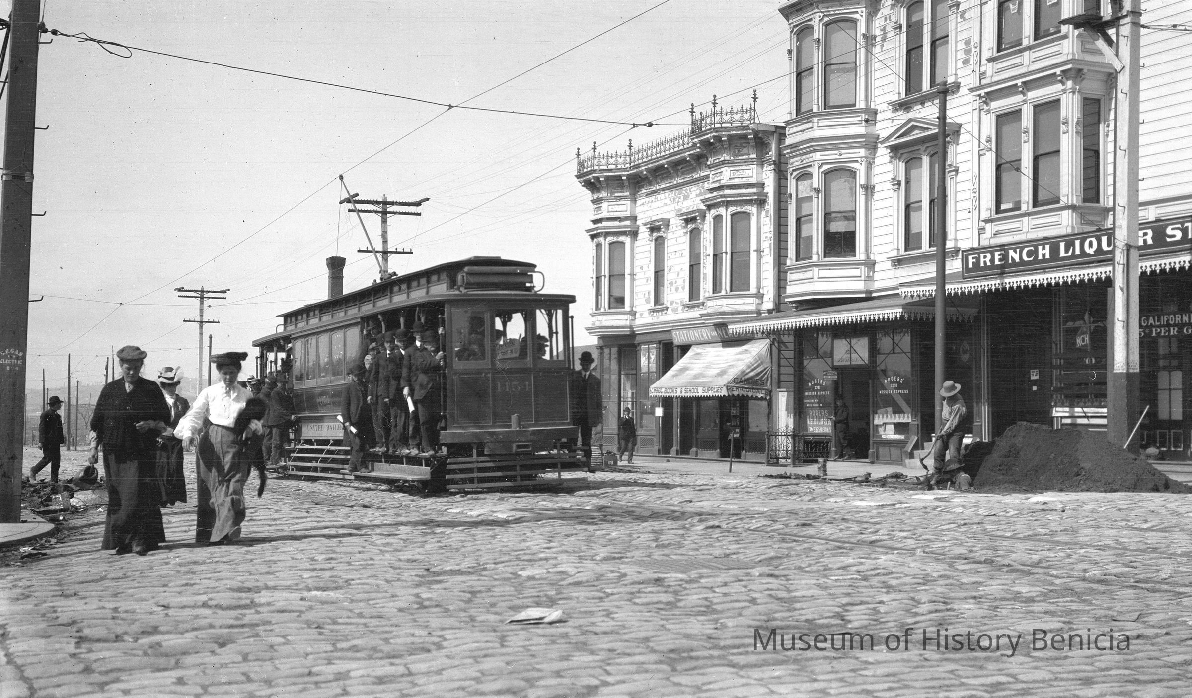 Street scene, San Francisco the earthquake in 1906. 1906 SF earthquake street scenes. People riding an electric streetcar. Store in back is French Liquor Store, 2391 Rogers Mission Express, and a stationary store.Collection