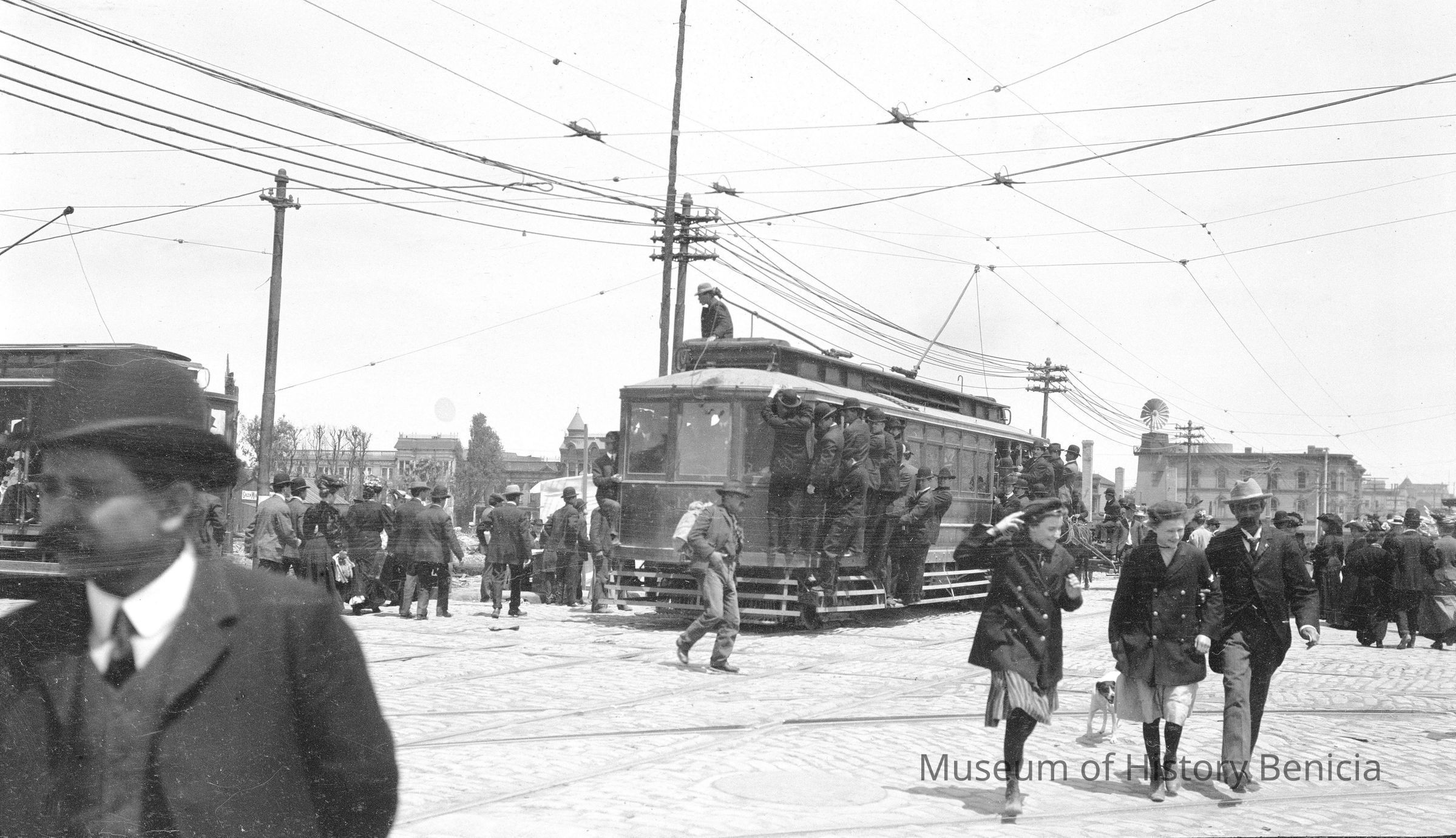 Street scene, San Francisco the earthquake in 1906. 1906 SF earthquake street scenes. Guys crowding on a streetcar and two girls in a uniform coat walking away.Collection