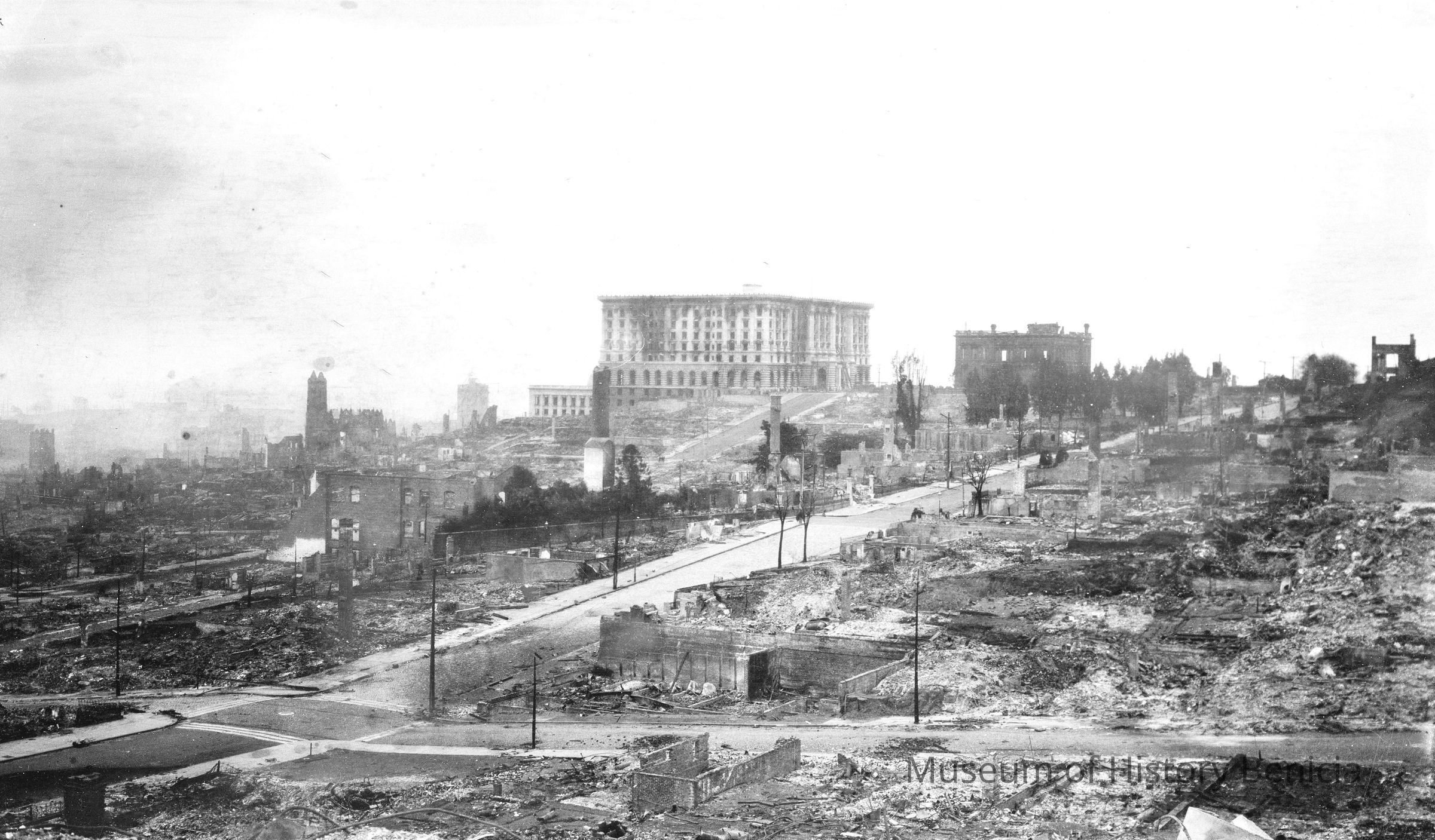 Street scene, San Francisco the earthquake in 1906. 1906 SF earthquake street scenes. Scene of destruction looking up to hotel.