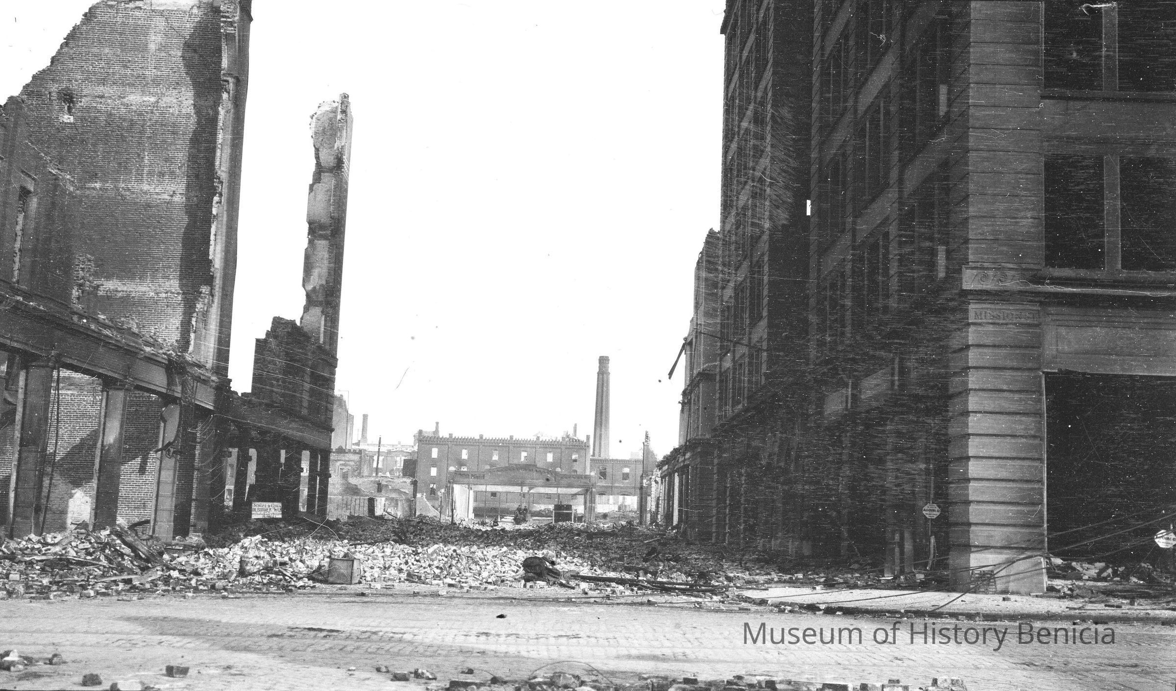 Street scene, San Francisco the earthquake in 1906. 1906 SF earthquake street scenes. Lot full of bricks between other buildings.