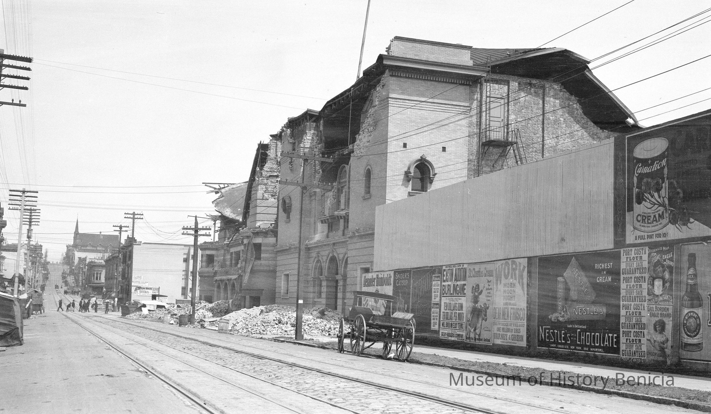 Street scene, San Francisco the earthquake in 1906. "1906 SF earthquake street scenes. Two buildings with fascinating history were both destroyed in 1989. The large building in the center was Temple Beth Israel, which was later rebuilt. However, the building burned in 1989 shortly before the earthquake. Albert Pike Scottish Rite Temple was rebuilt and later sold to the Rev. Jim Jones who occupied it as Peoples Temple. It was from here he led members of his congregation to their doom in Jonestown. Peoples Temple was later sold to a Korean church, damaged during the 1989 earthquake, and demolished. The wooden fence encloses the lot that would later become Majestic Hall, and then the Fillmore Auditorium at Fillmore and Geary streets. "Collection