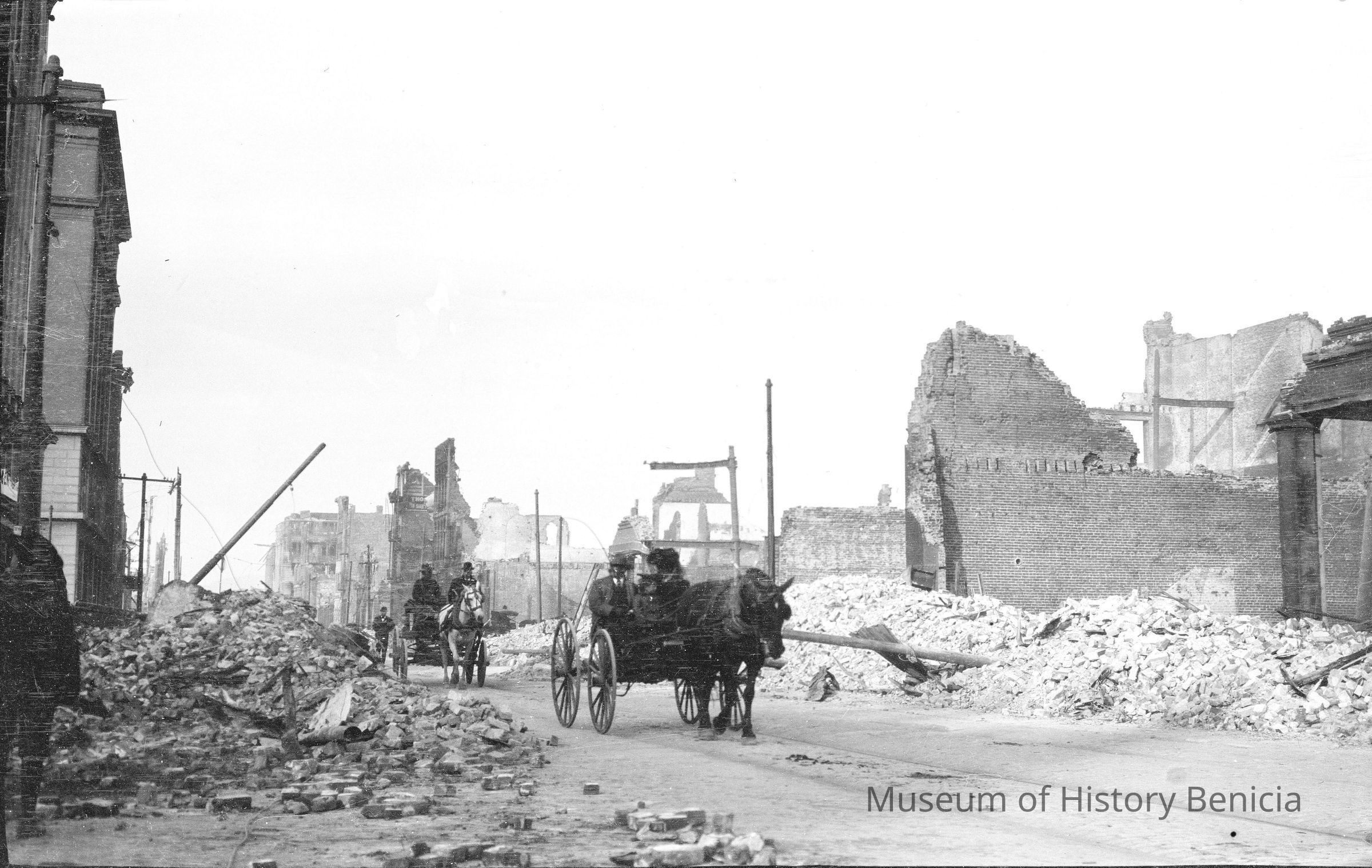 Street scene, San Francisco the earthquake in 1906. 1906 SF earthquake street scenes. Carriages driving through destruction.