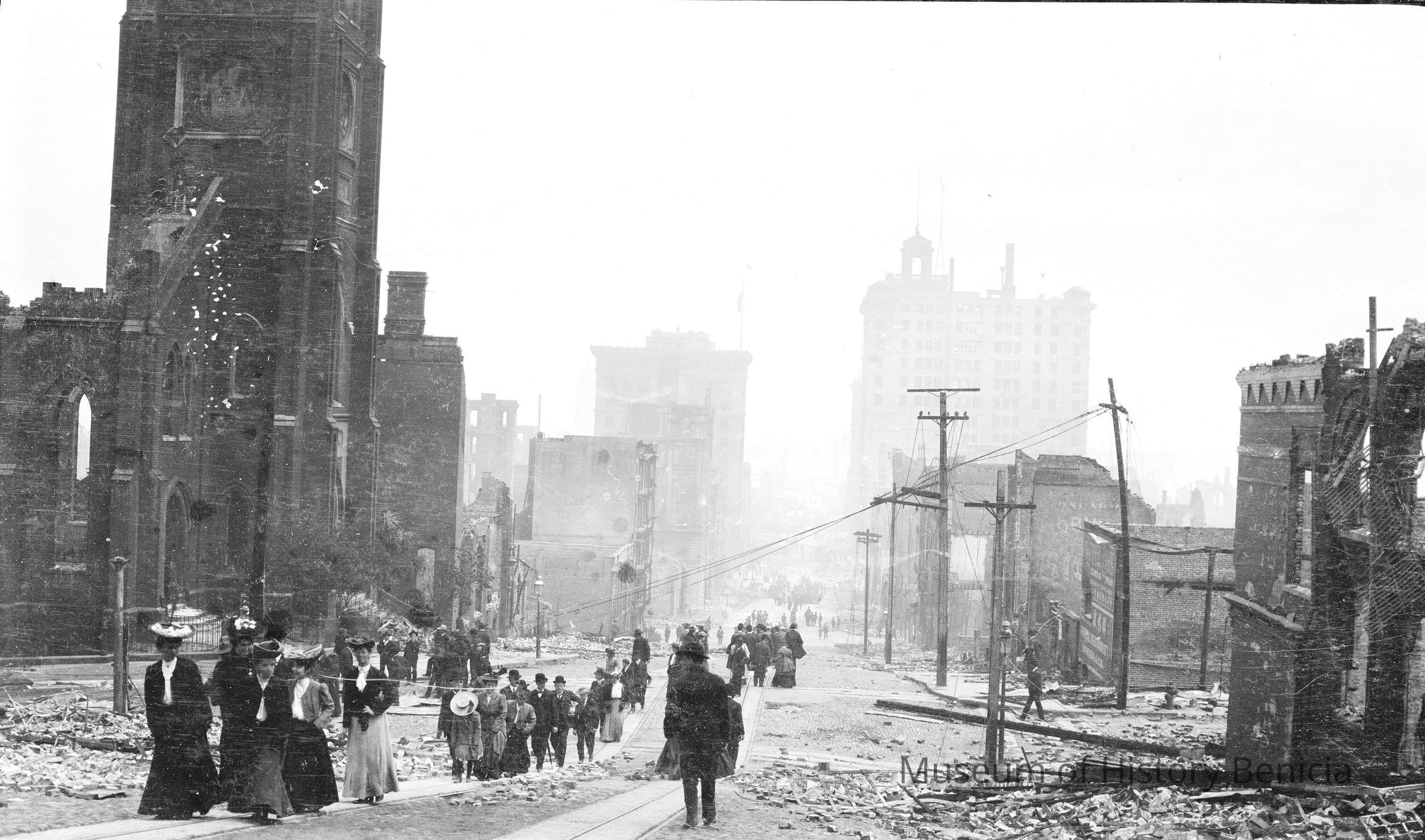 Street scene, San Francisco the earthquake in 1906. People walking up street car tracks.