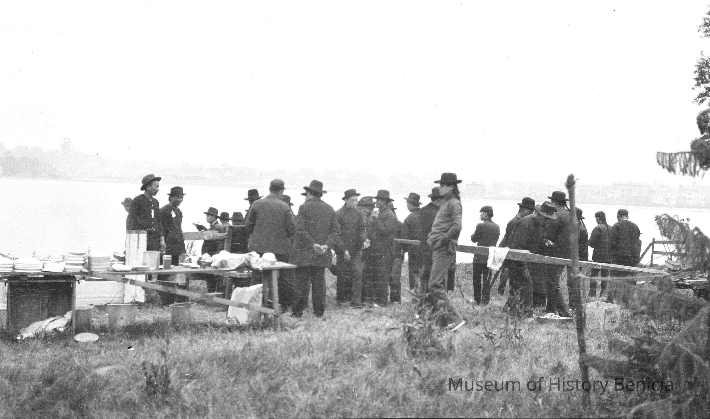 Image of Oakland after the 1906 earthquake. "1906 earthquake damage in Oakland. Group of Chinese men by the water eating. Could be a soup kitchen for Chinese. With virtually all of Chinatown destroyed, most of its inhabitants fled to Oakland, other cities in the East Bay, or huddled in the refugee camp at the west end of the Presidio. There were 500 refugees in that encampment as of April 26. Initial attempts by the committee to concentrate Chinese refugees at the Presidio Golf Links met with immediate resistance, and the army summarily moved them to Fort Point on April 27. "Collection
