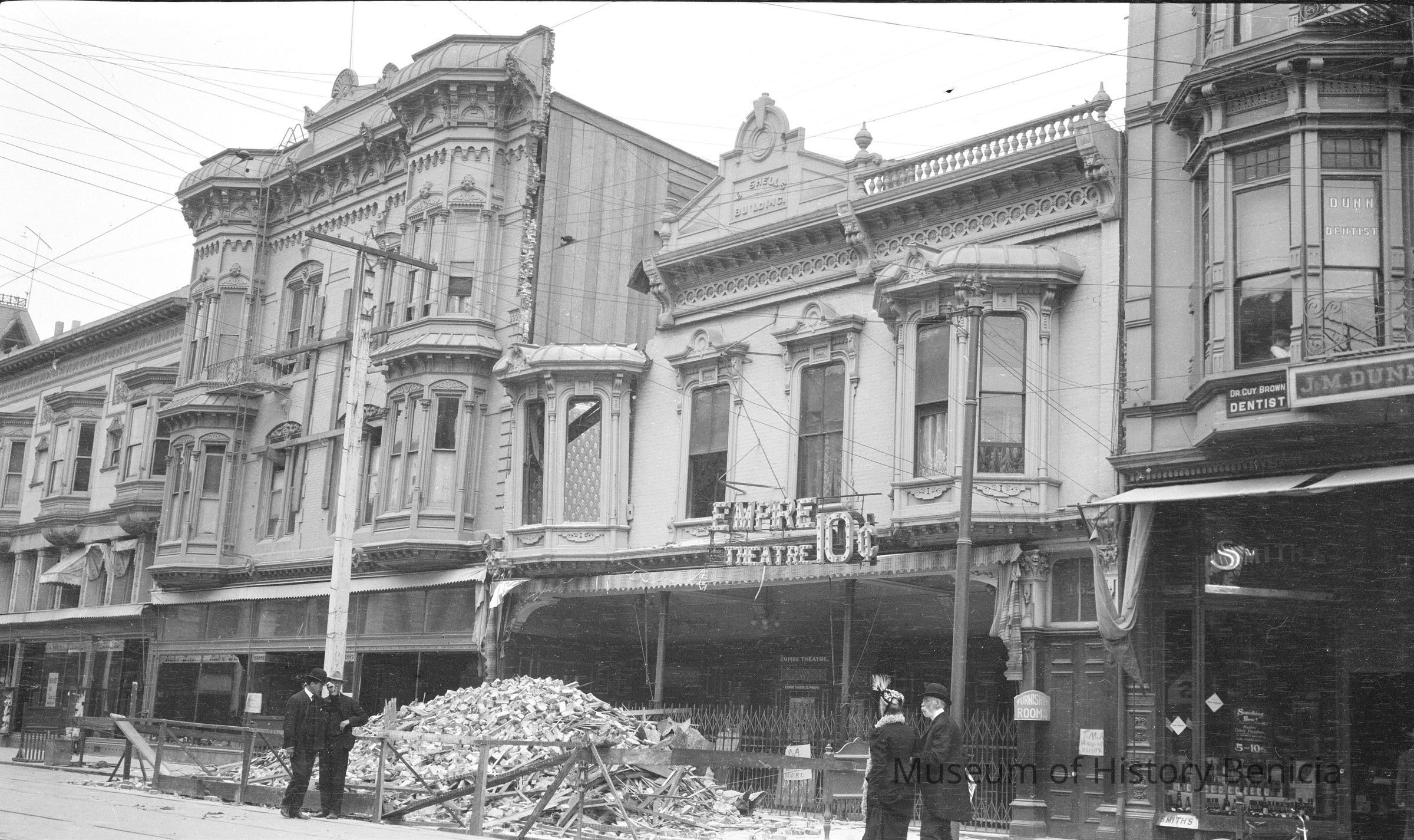 Image of Oakland after the 1906 earthquake. 1906 earthquake damage in Oakland. View of the Empire Theater and adjacent buildings (Dr Cuy Brown and JM Dunn dentists).Collection