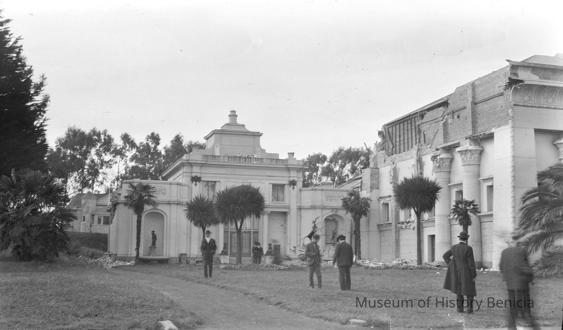 Damage in Golden Gate Park, San Francisco after the earthquake. 1906 earthquake damage in Golden Gate Park. Old DeYoung museum(?)
