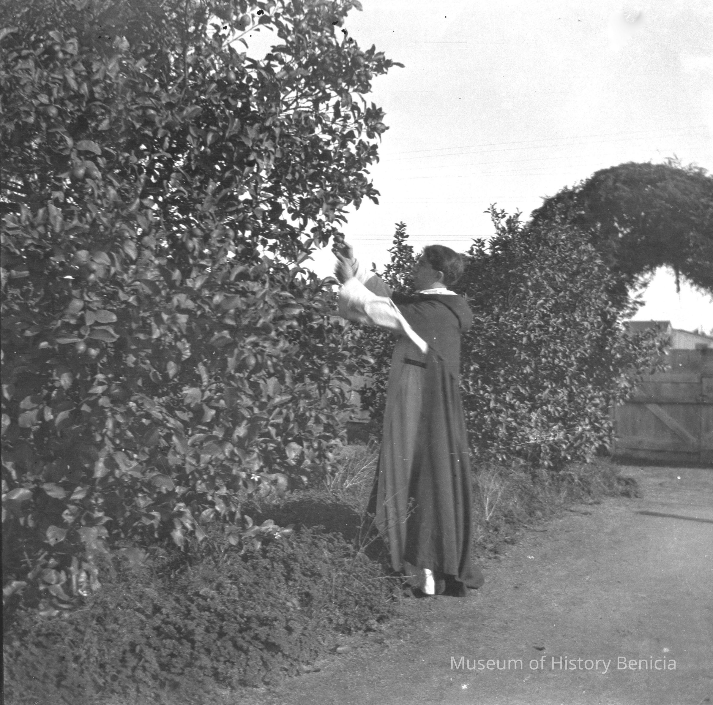 A man standing in front of a tree and reaching up towards its leaves. He is dressed in robes that look like some fraternal organization.