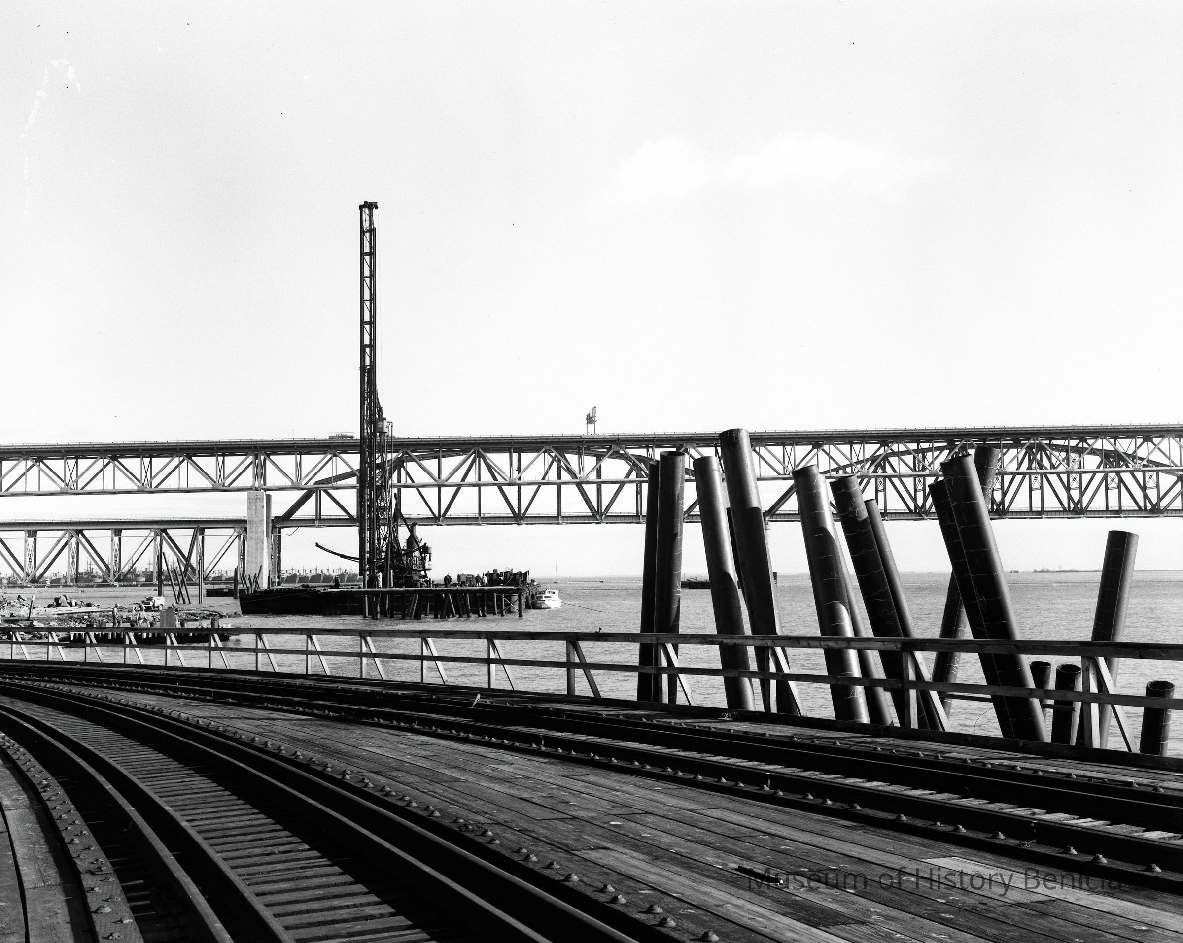 B/W negative ground view of pile driver and pilings for dock construction, the Benicia/Martinez and SP Railroad bridges are in the background.