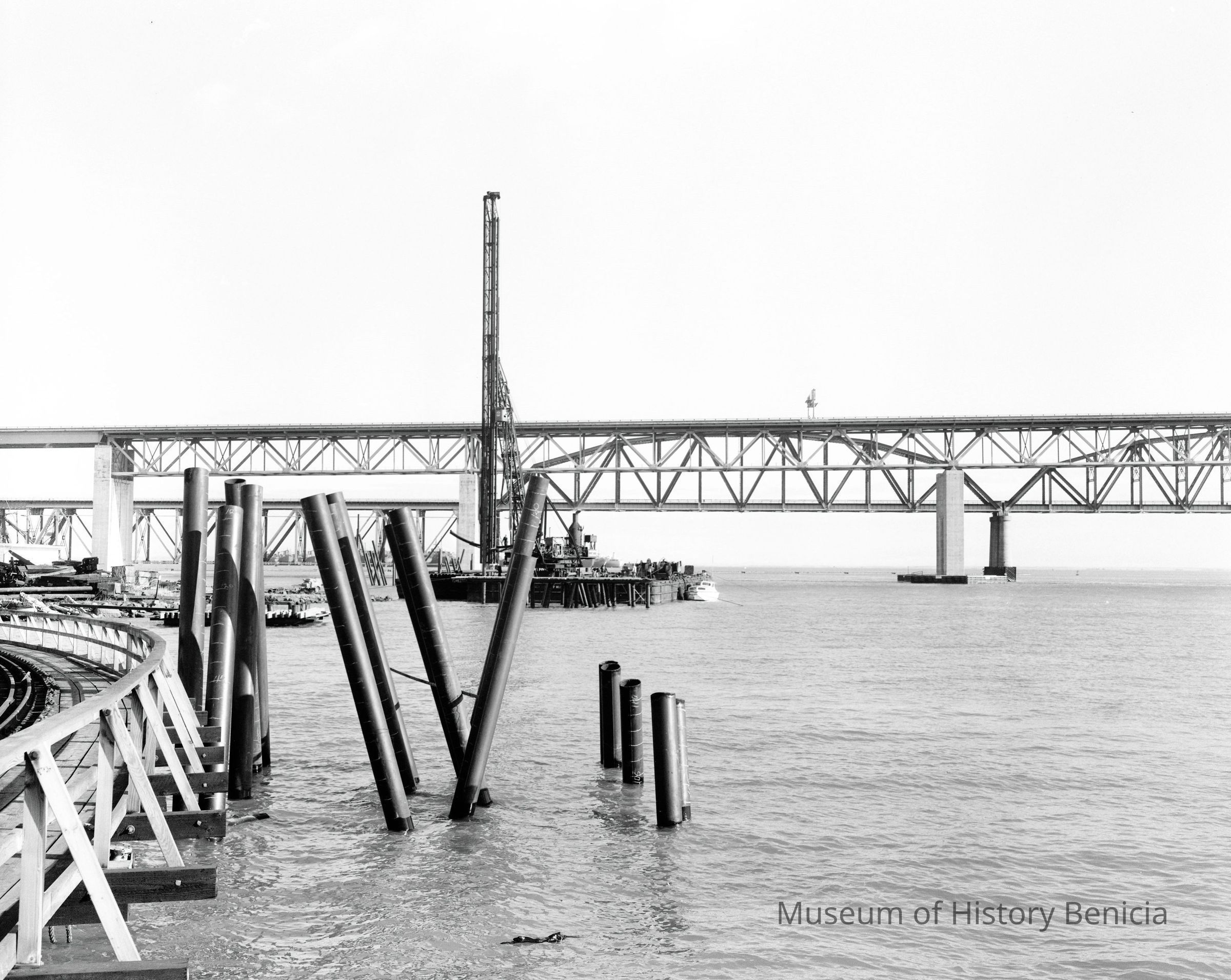 B/W negative ground view of pile driver and pilings for dock construction, the Benicia/Martinez and SP Railroad bridges are in the background.